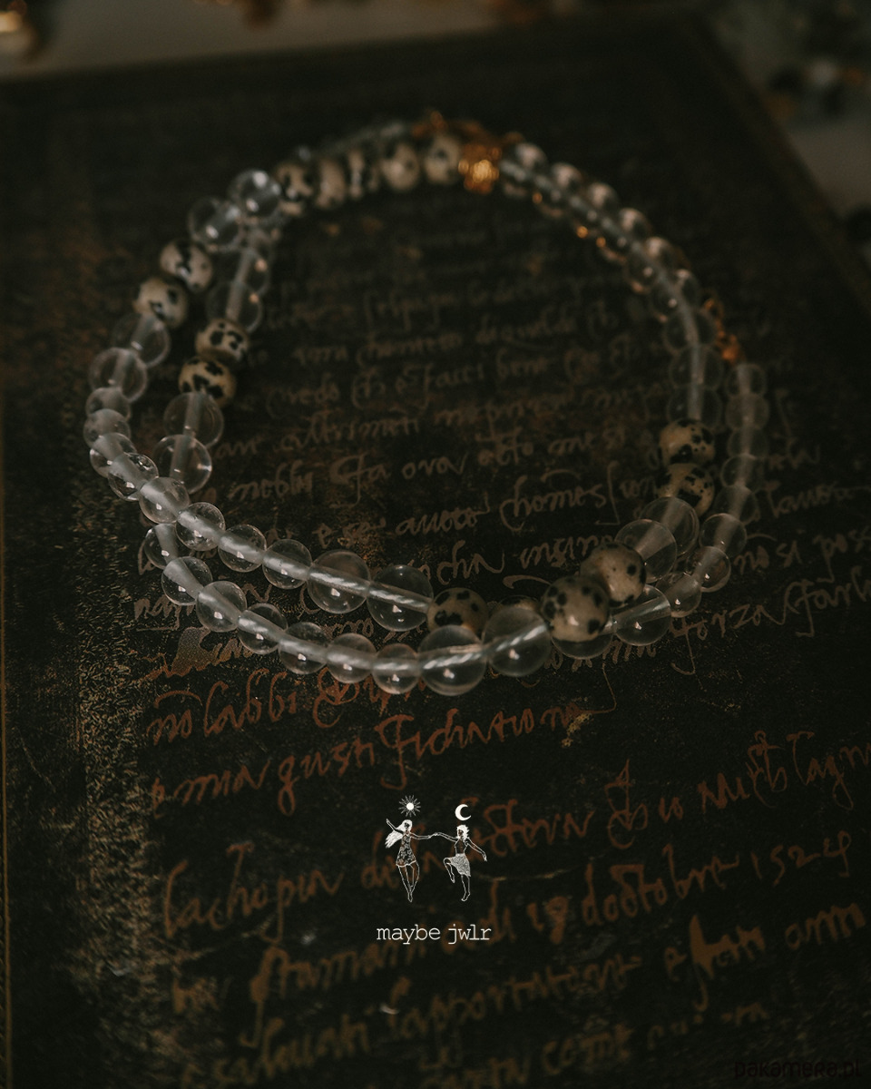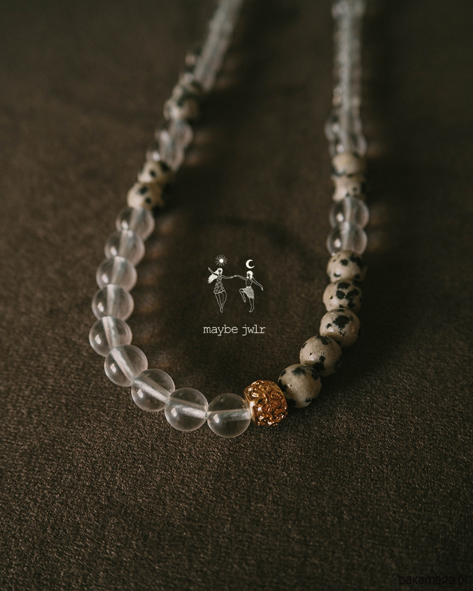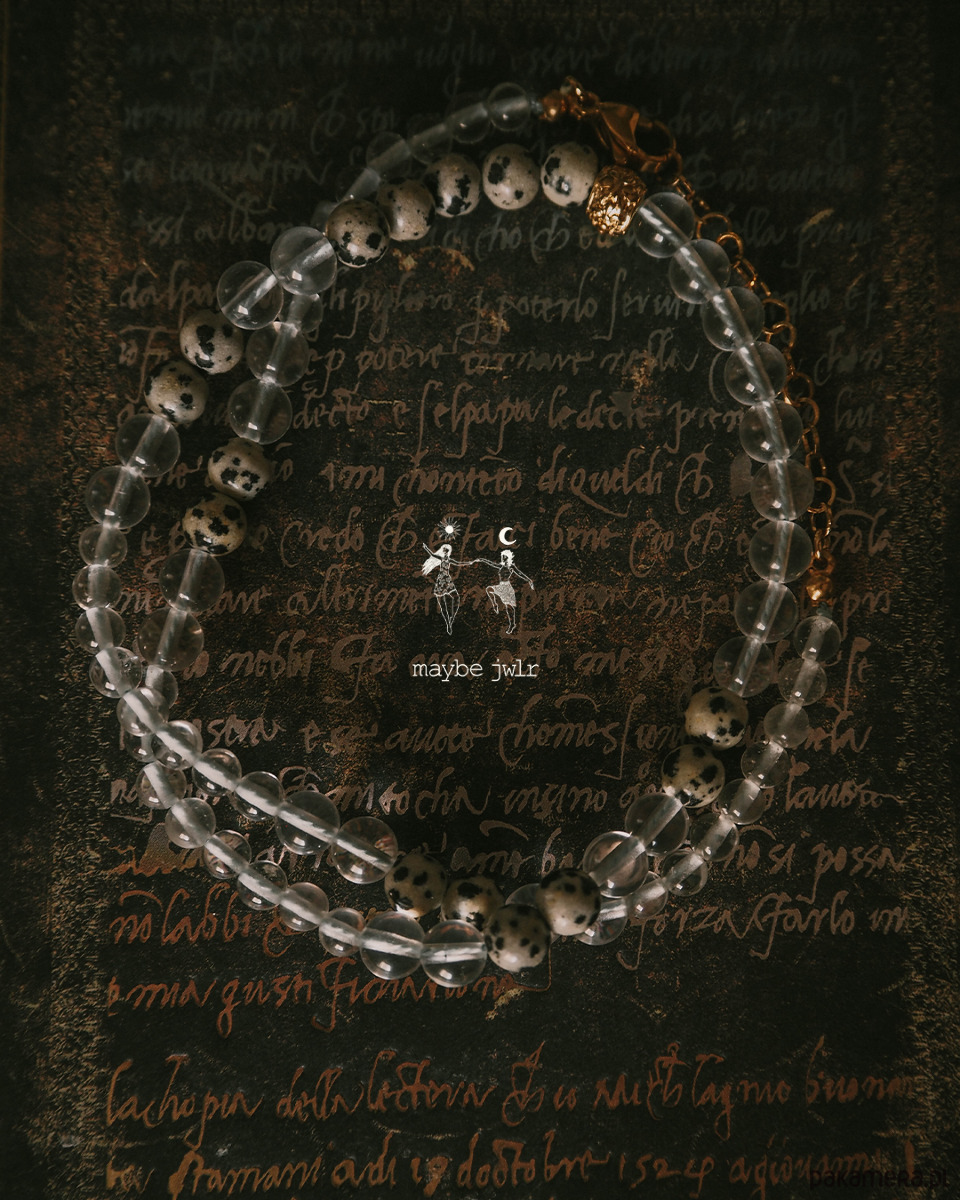 Ten naszyjnik to połączenie przejrzystości i struktury, światła i ziemi. Z jednej strony kryształ górski – znany jako „król kryształów”, symbol klarowności, świeżej energii i wewnętrznego balansu. Z drugiej jaspis dalmatyński – kamień, który dodaje lekkości, odwagi i dobrego nastroju. Razem tworzą duet, który wygląda subtelnie, a jednocześnie ma w sobie moc.