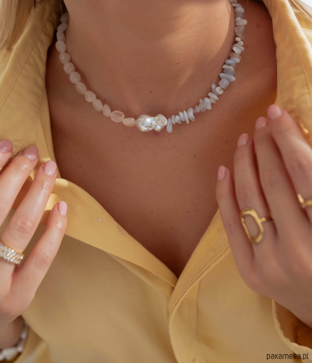 To biżuteria, która doskonale łączy w sobie styl, symbolikę i wygodę noszenia. Materiał: kryształ górski, chalcedon, perła barokowa, pozłacana stal chirurgiczna Długość: 41,5 cm (+ 5 cm przedłużenia) Znaczenie: kryształ górski - harmonia i oczyszczenie, chalcedon - spokój, perła - kobiecość i naturalność