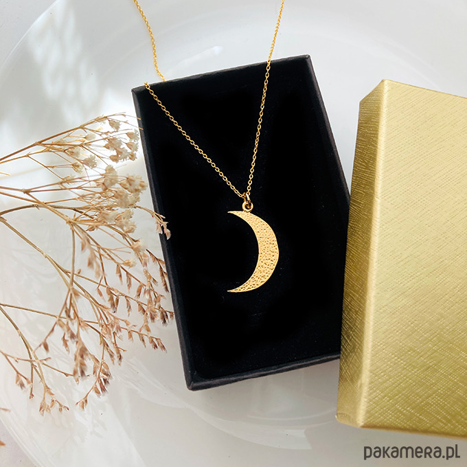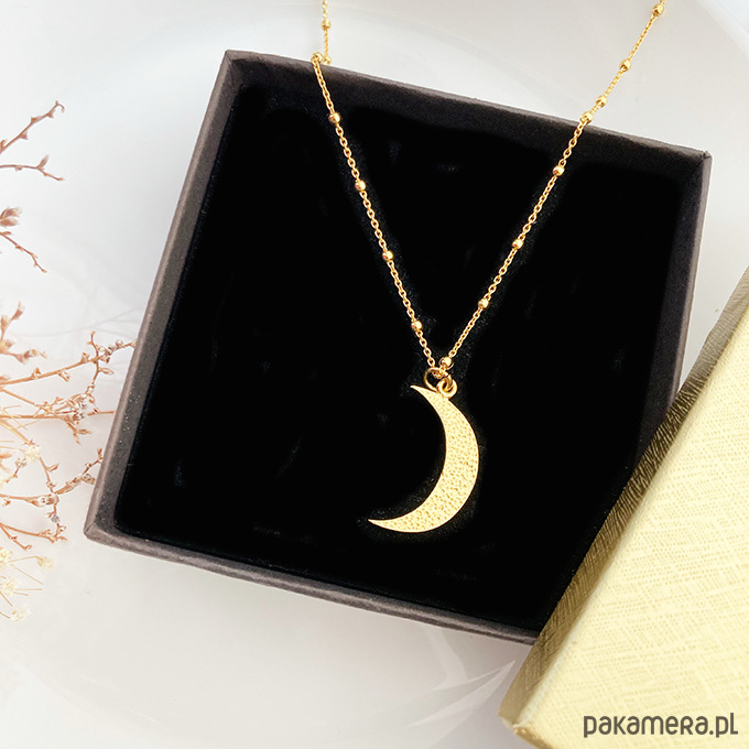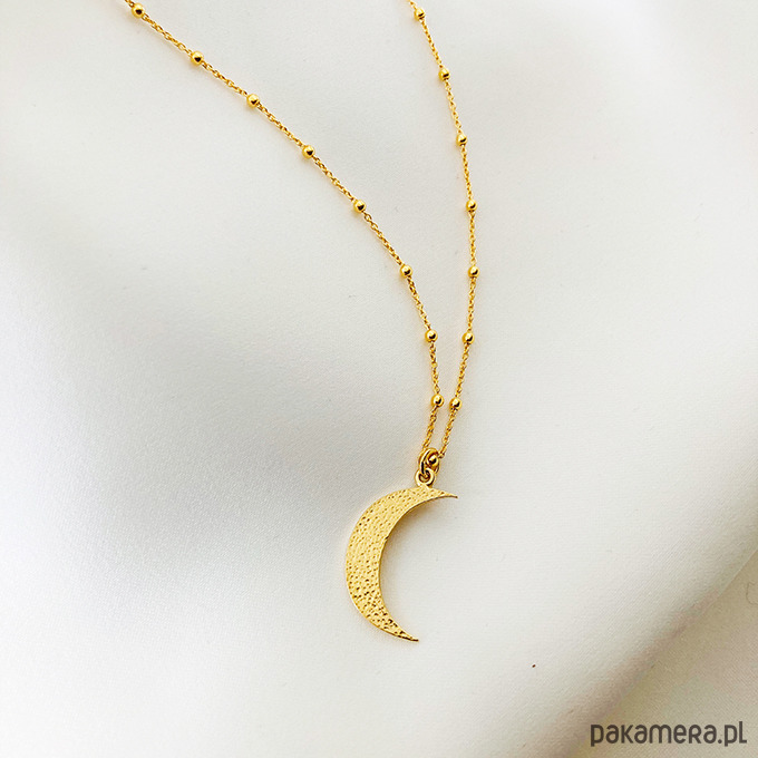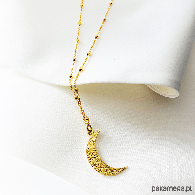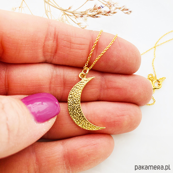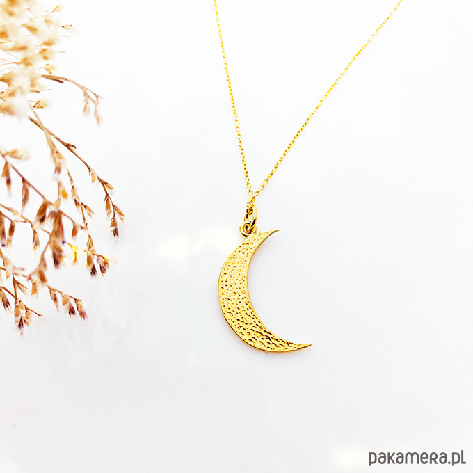 Efektowny naszyjnik z dużą, młotkowaną zawieszką w kształcie księżyca.