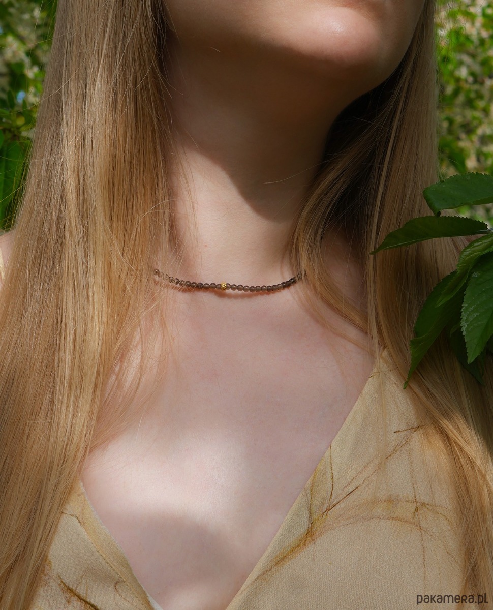 Delikatny, minimalistyczny naszyjnik z gładkimi kulkami kwarcu dymnego. Zakończony łańcuszkiem i klasycznym zapięciem. Srebro 925, złocone 24 k złotem.