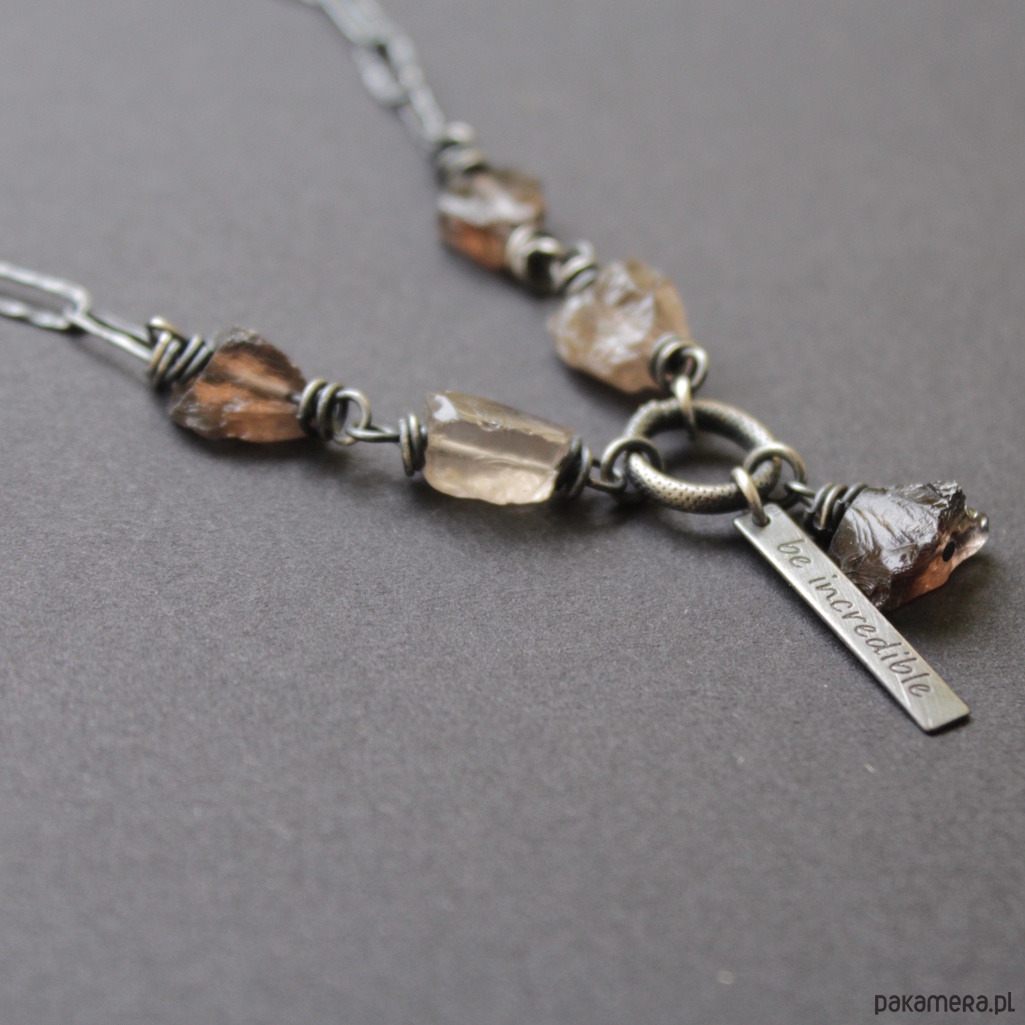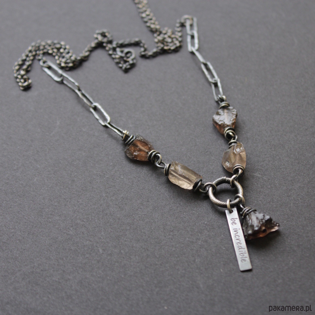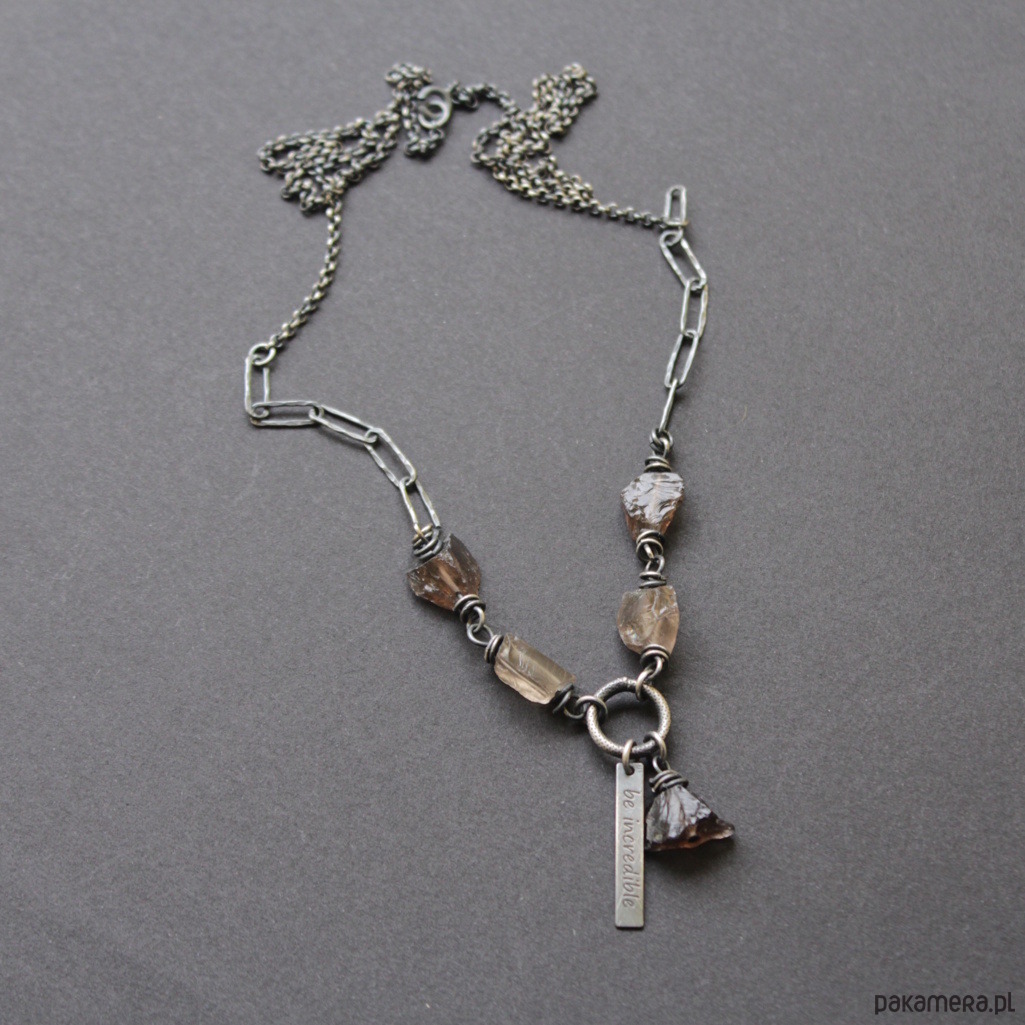 Oryginalny naszyjnik wykonany został z oksydowanego srebra próby 925 oraz przepięknych surowego błękitnego kwarcu dymnego wielkości 0,7-1 cm.