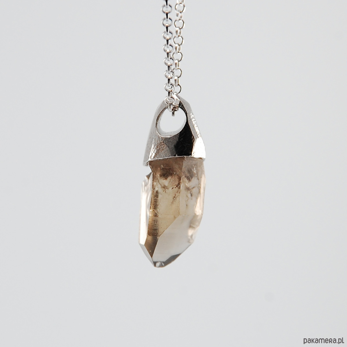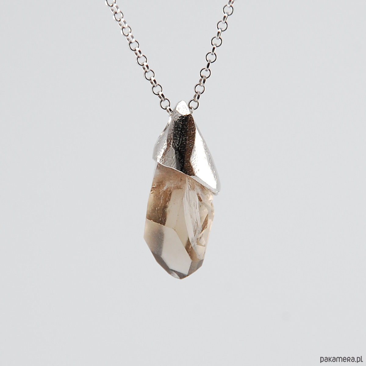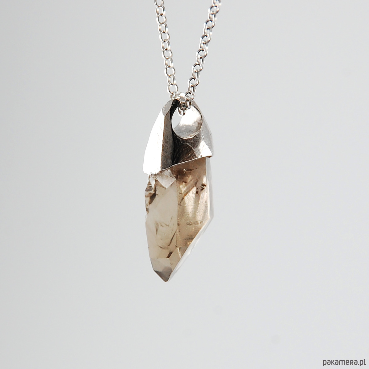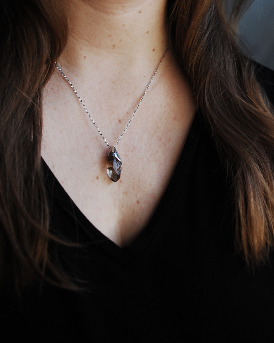 Naszyjnik wykonany z unikatowej bryłki kwarcu dymnego oprawionego w srebro.
