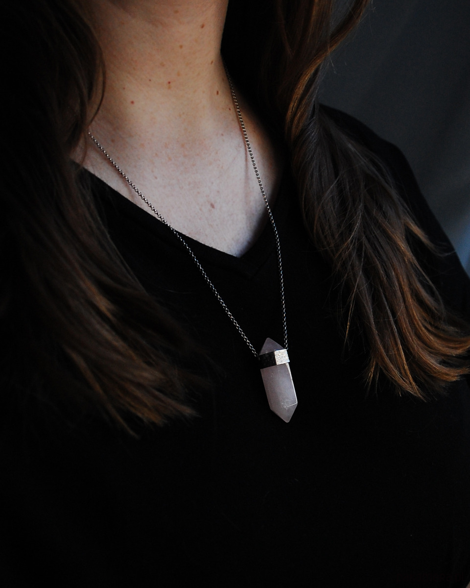 Naszyjnik z różowym kwarcem oprawionym w młotkowane srebro próby 925. Pokryty szlachetnym rodem dzięki czemu srebro nie ciemnieje.