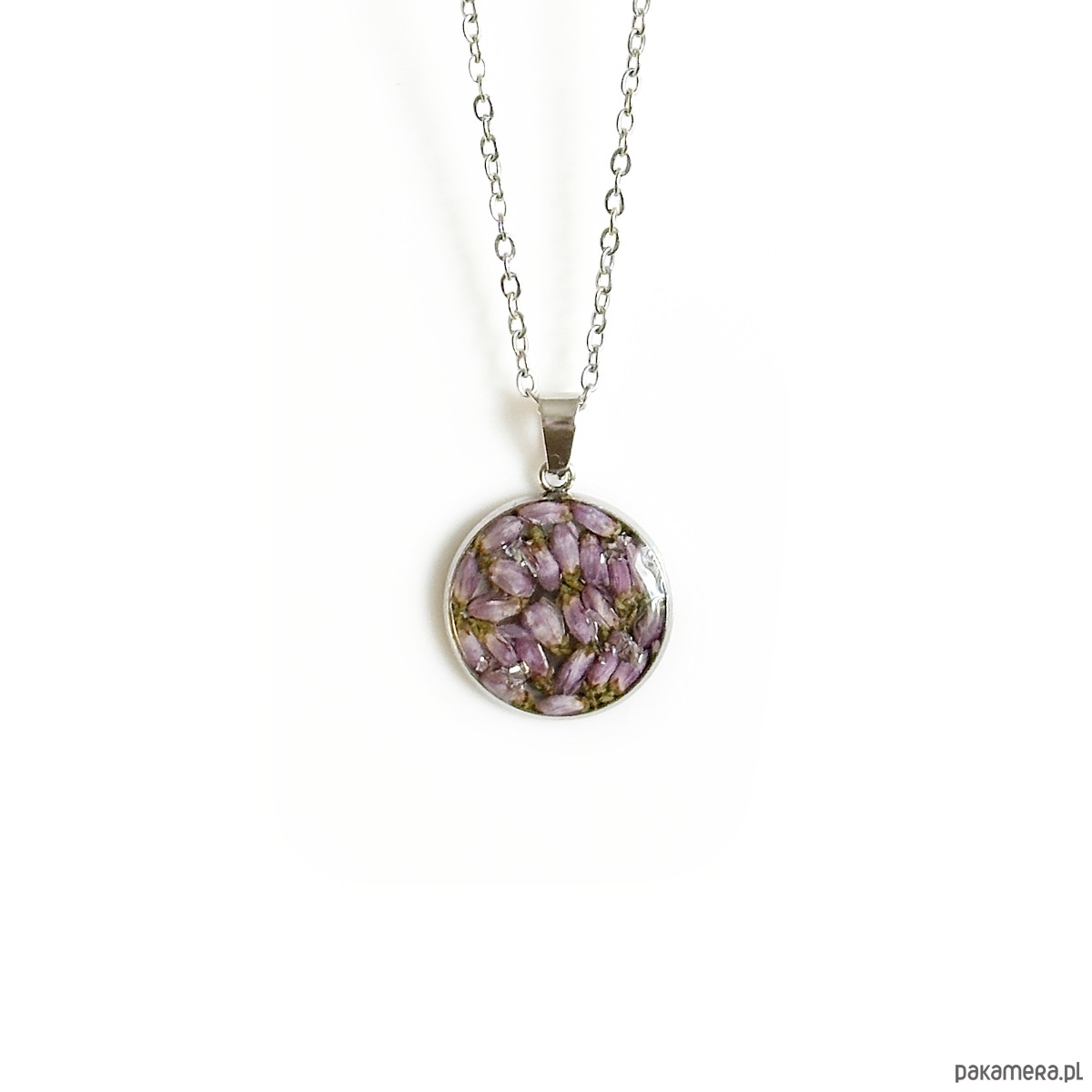 Naszyjnik o wymiarach 1,6cm. Zostały w nim zatopione kwiaty wrzosu.