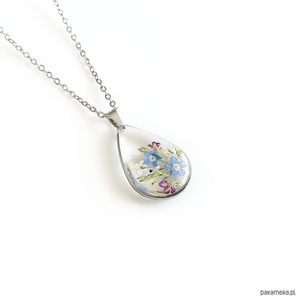 W naszyjniku zostały utrwalone kwiaty niezapominajki, dzika marchew, smagliczka.