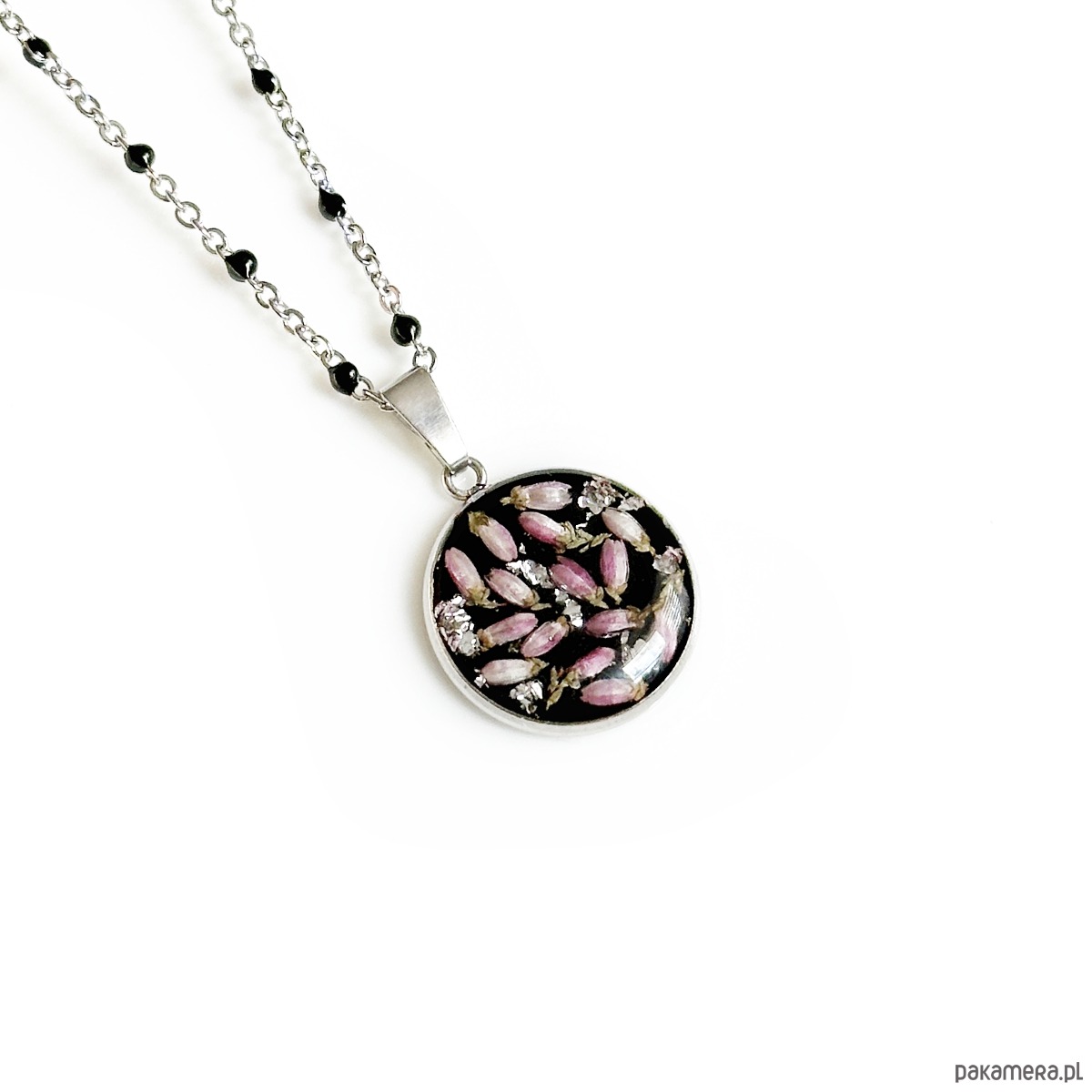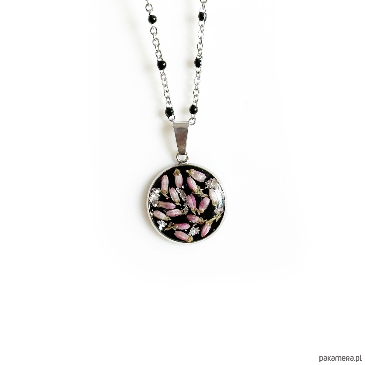 Naszyjnik o wymiarach 1,6cm. Zostały w nim zatopione kwiaty wrzosu.