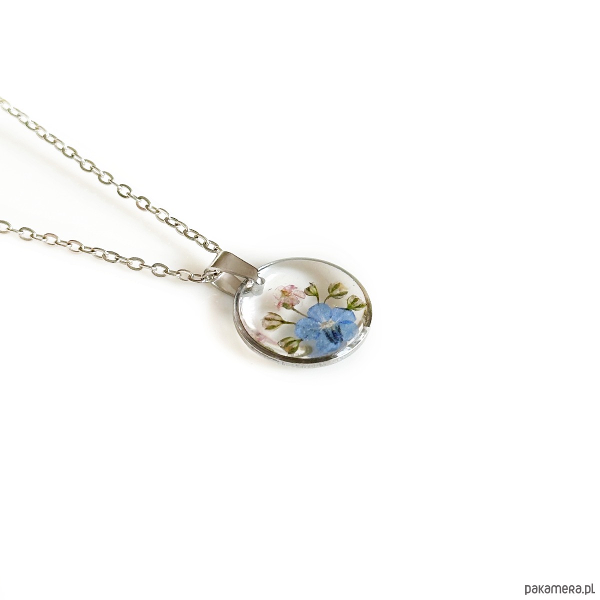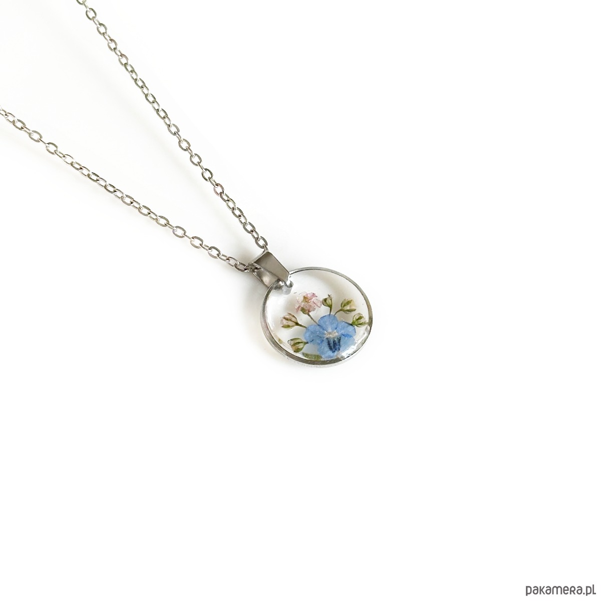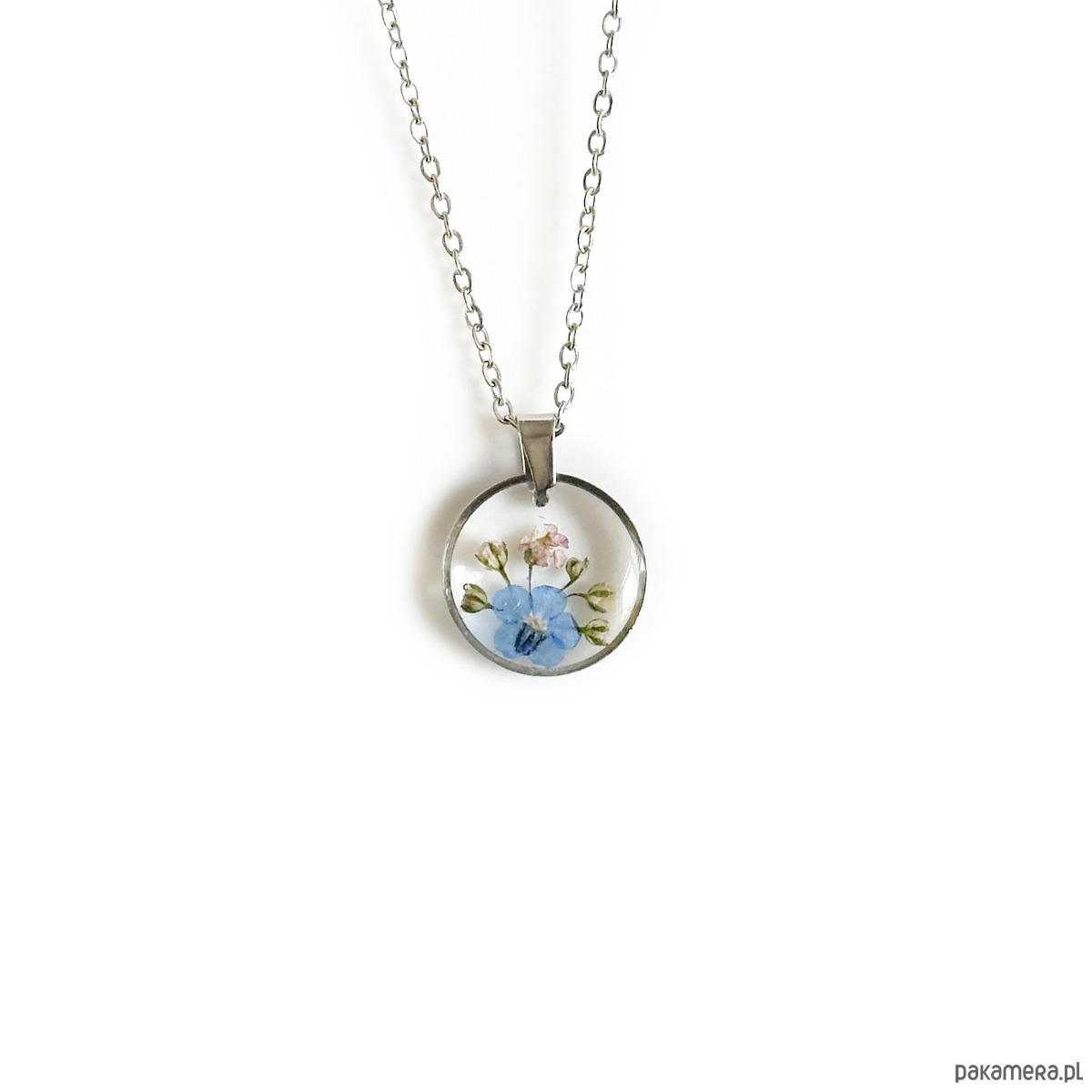 W naszyjniku zostały utrwalone kwiaty niezapominajki, gipsówka, smagliczka.
