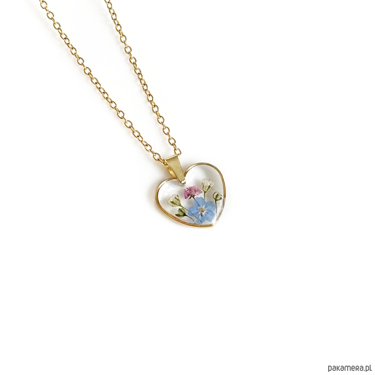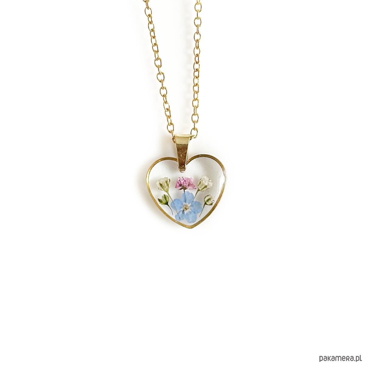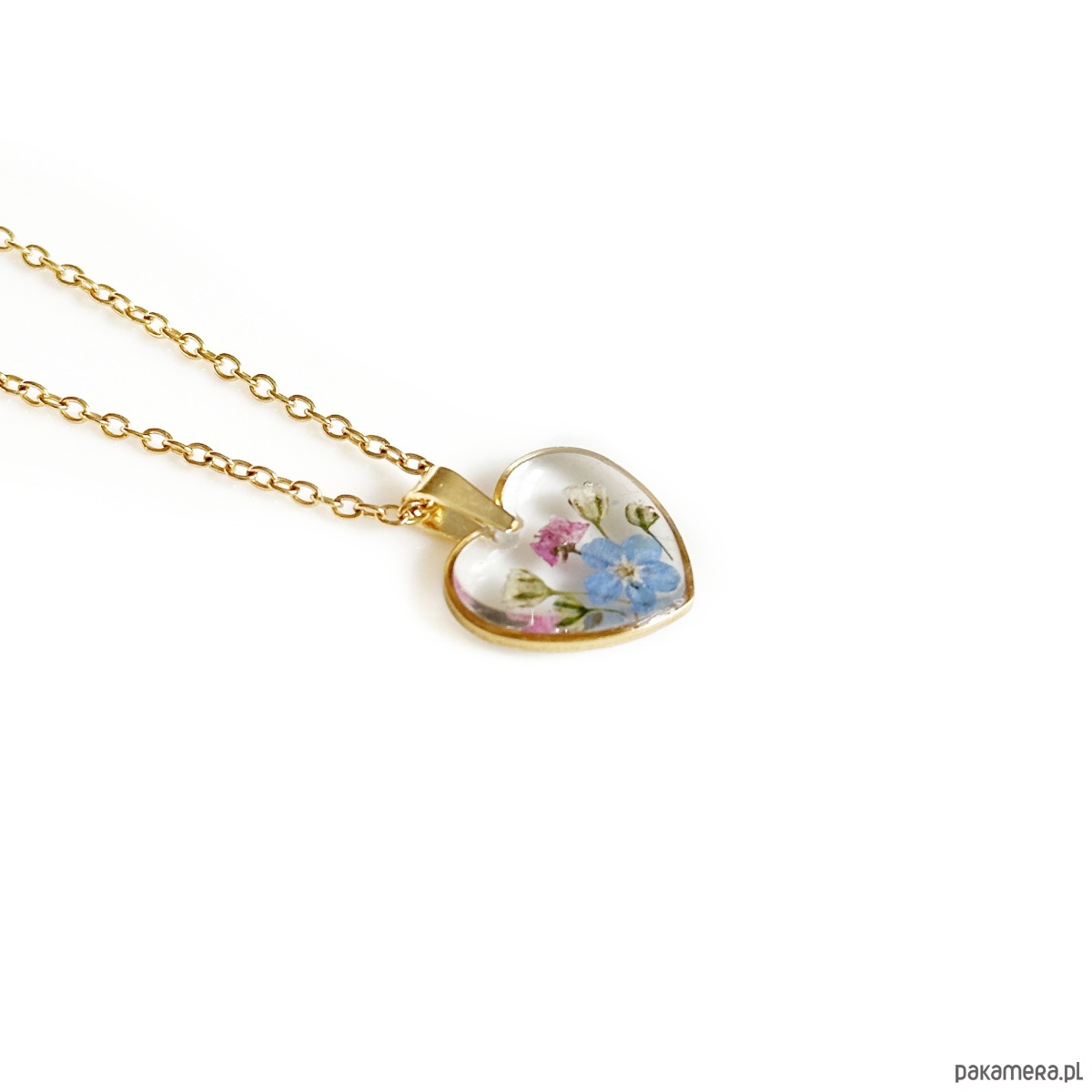 W naszyjniku zostały utrwalone kwiaty niezapominajki, gipsówka, smagliczka.