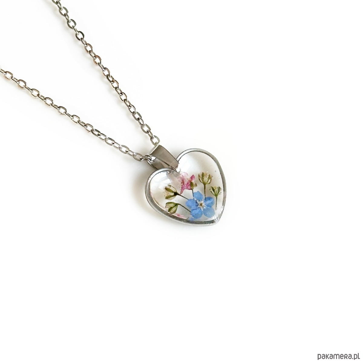 W naszyjniku zostały utrwalone kwiaty niezapominajki, gipsówka, smagliczka.