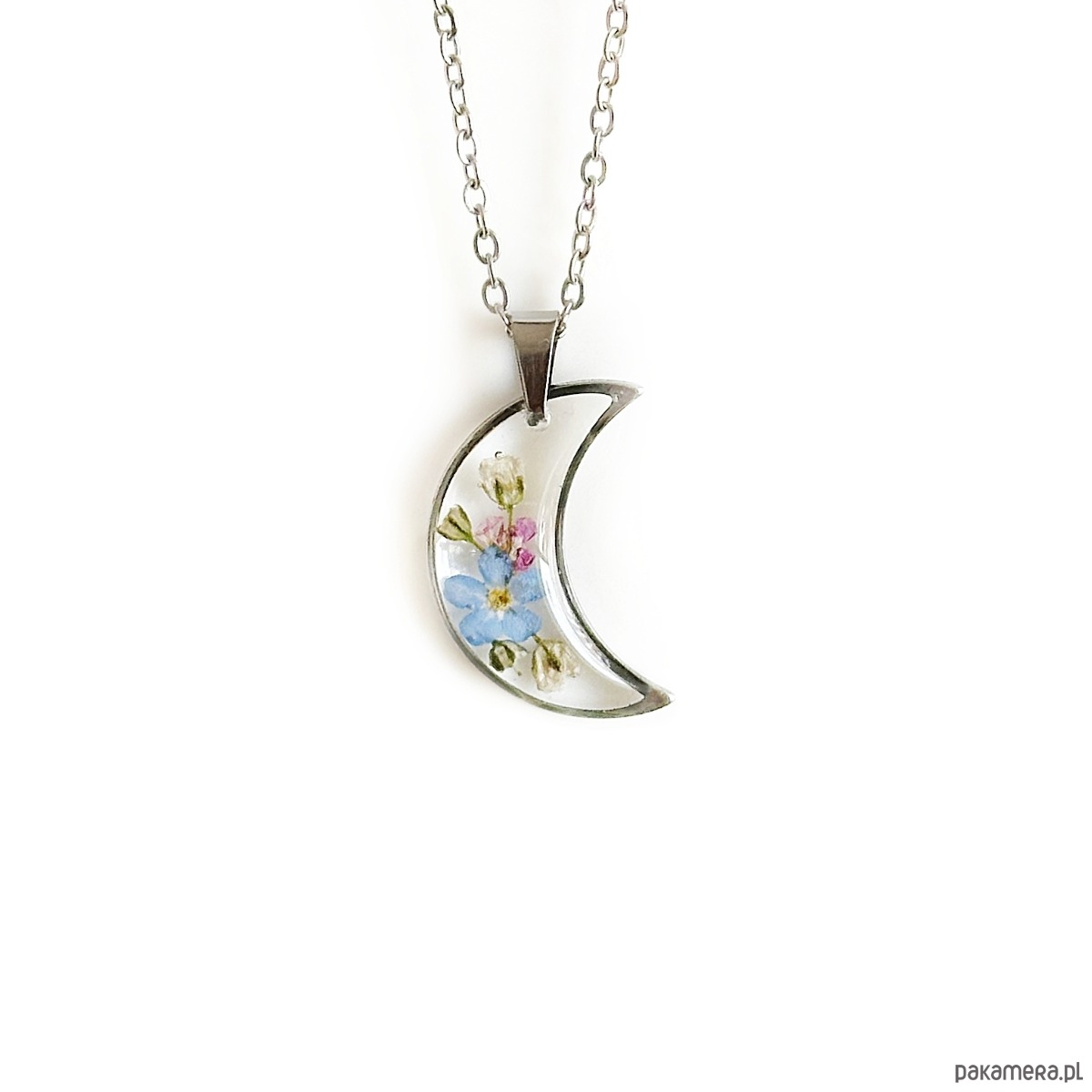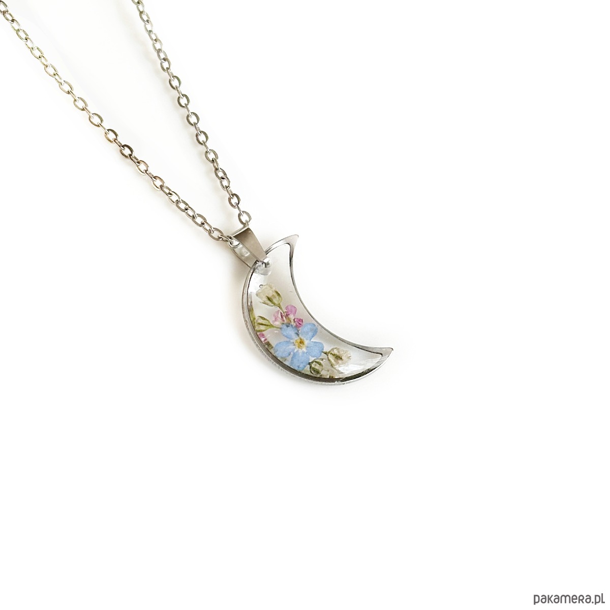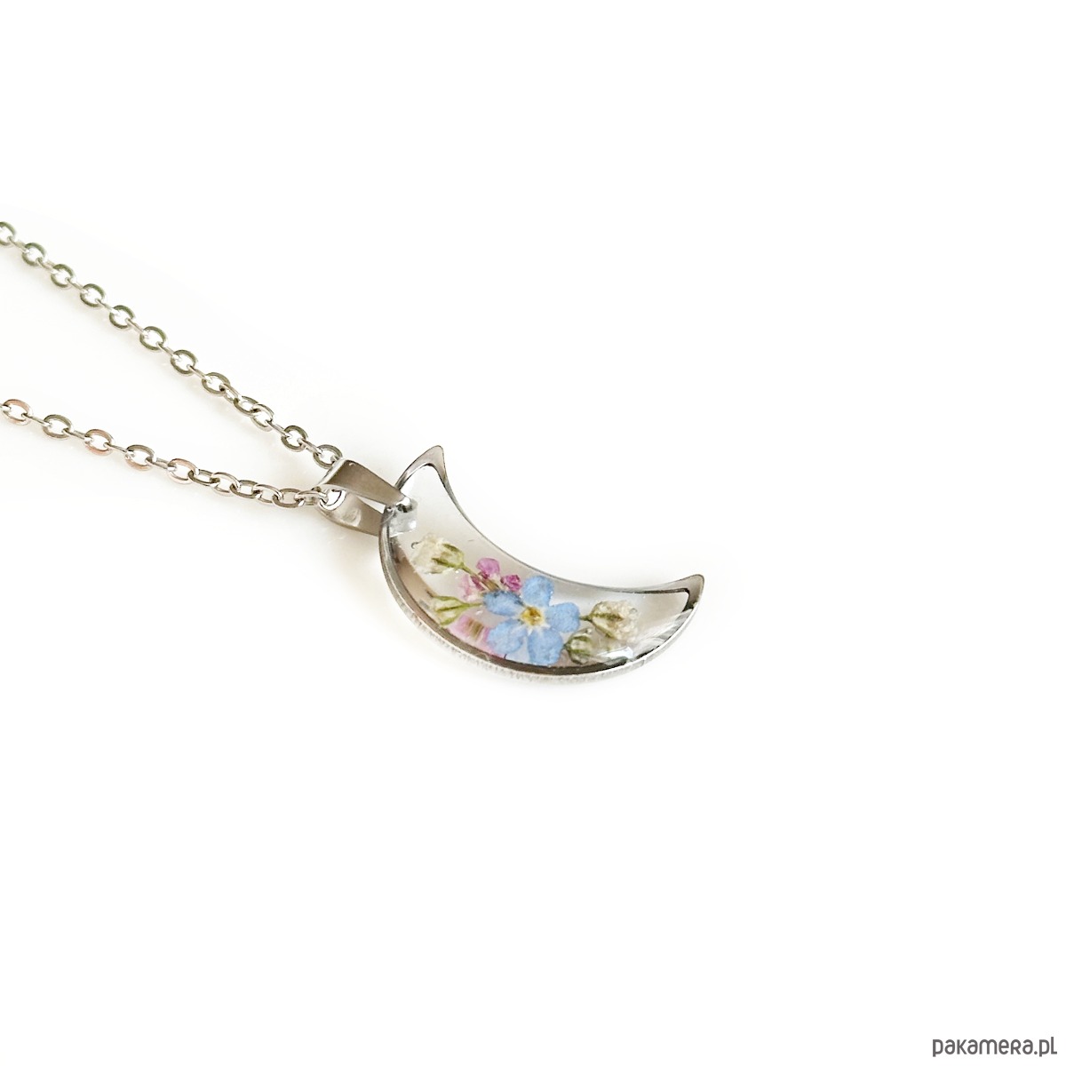 W naszyjniku zostały utrwalone kwiaty niezapominajki, gipsówka, smagliczka.