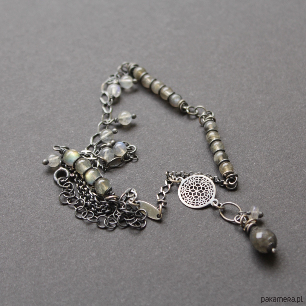 Oryginalny naszyjnik wykonany został z mocno oksydowanego srebra próby 925 oraz labradorytów wielkości 0,6-0,9 cm.