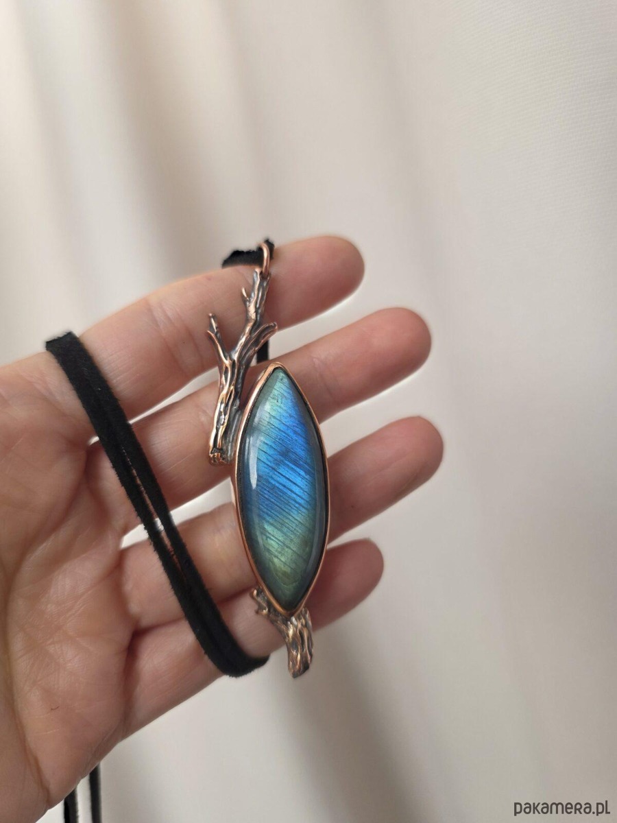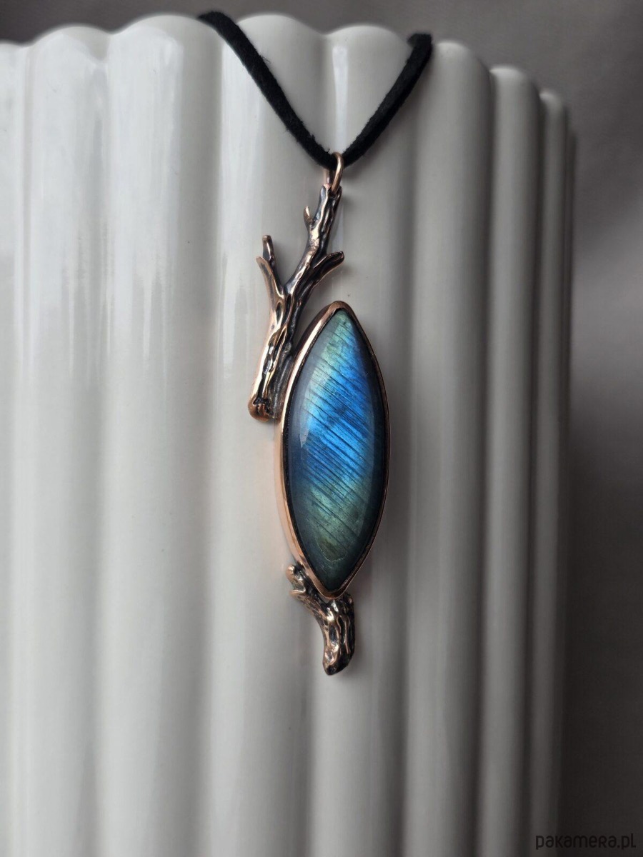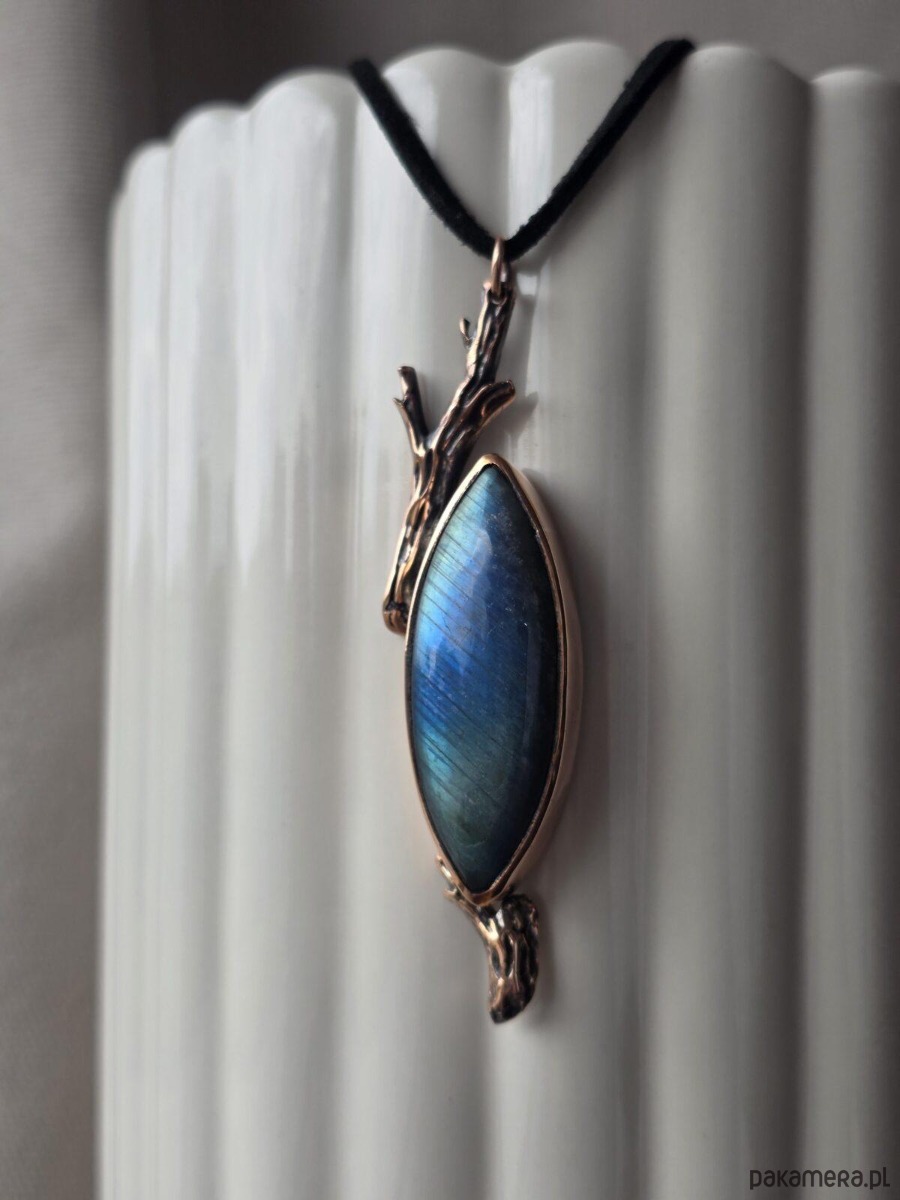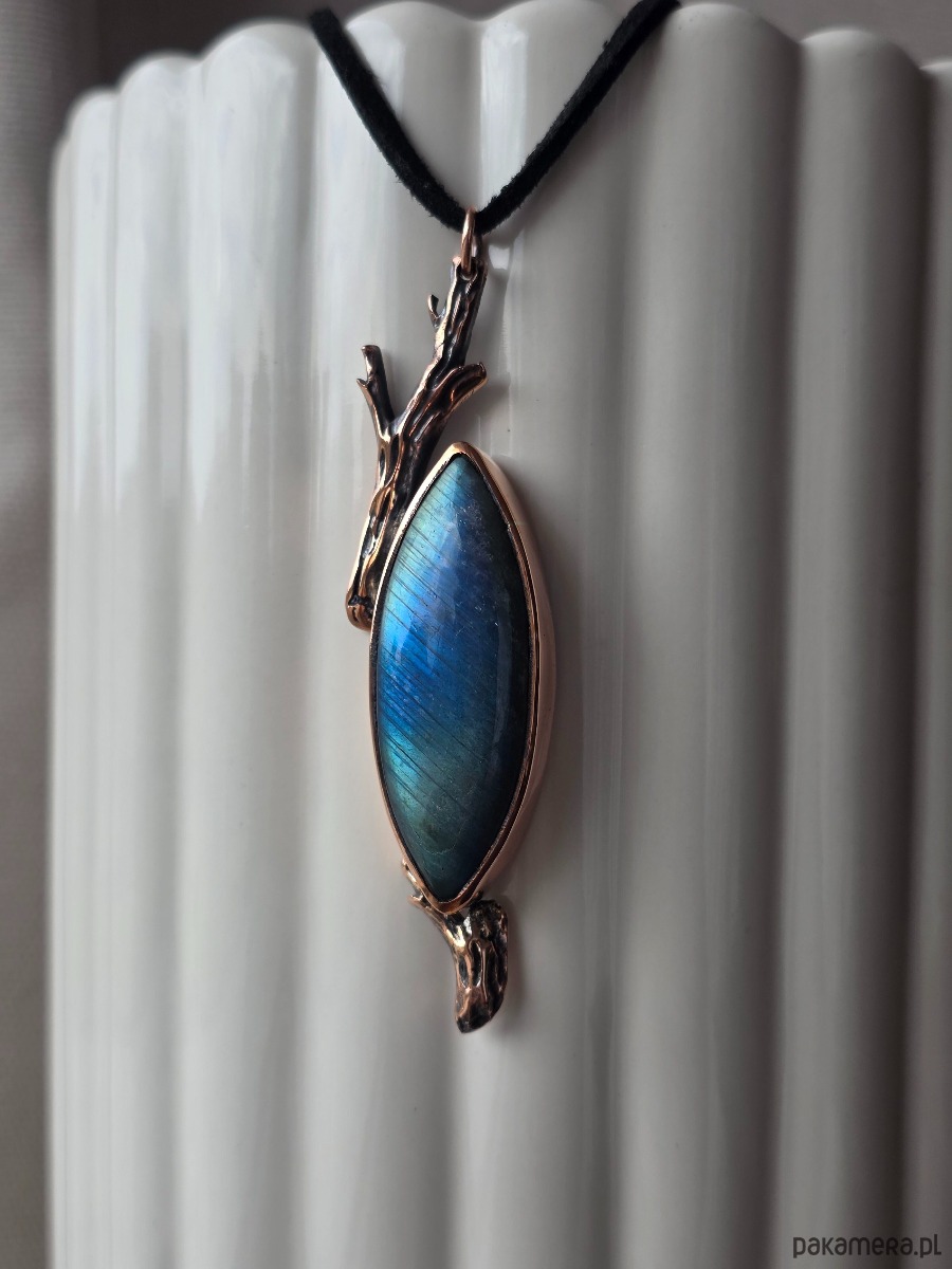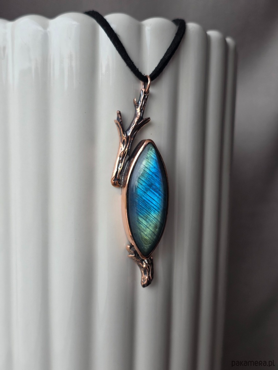 Użyte materiały: miedź, labradoryt w kształcie markizy: 41x15mm, czarny skórzany płaski rzemień