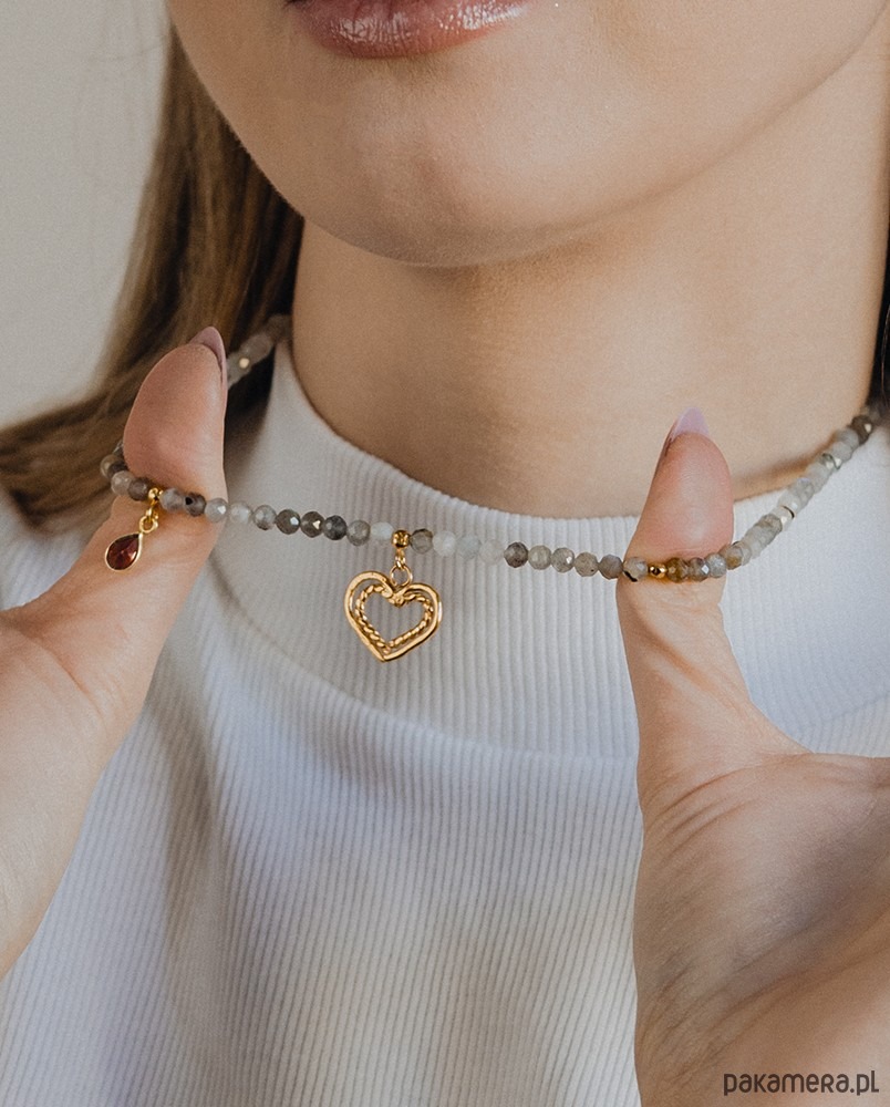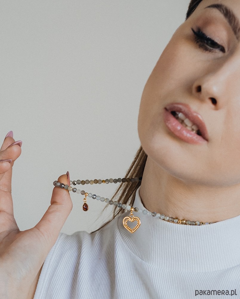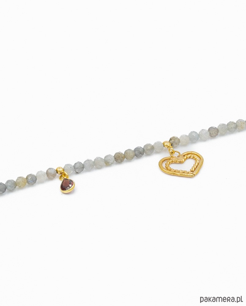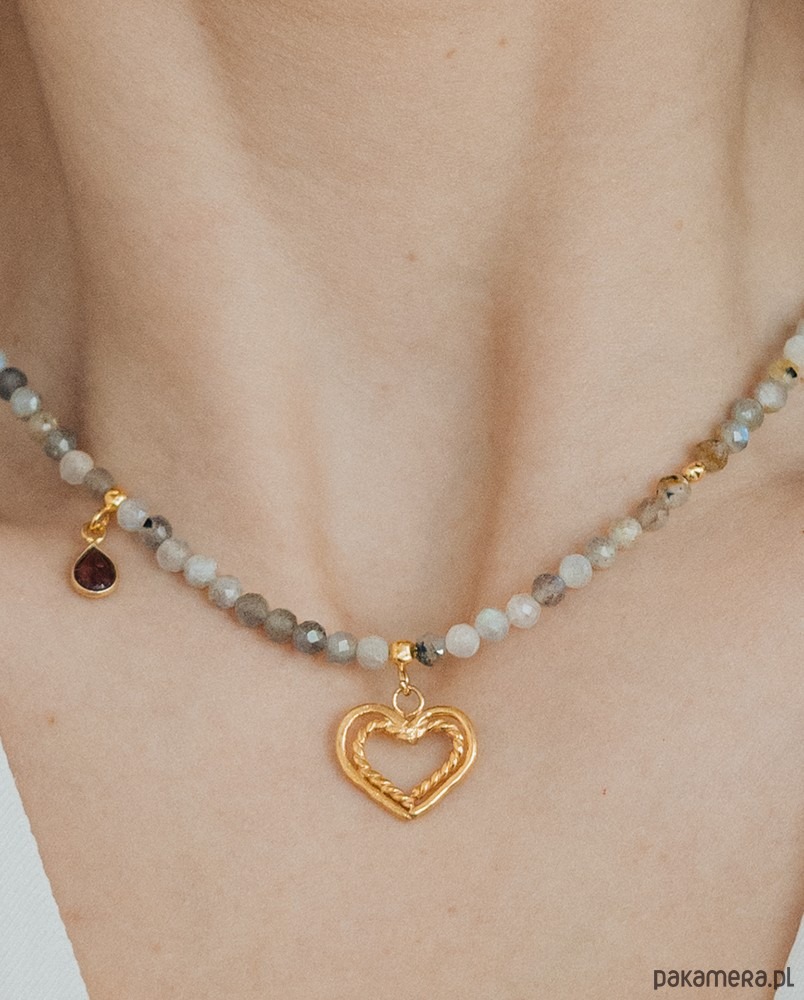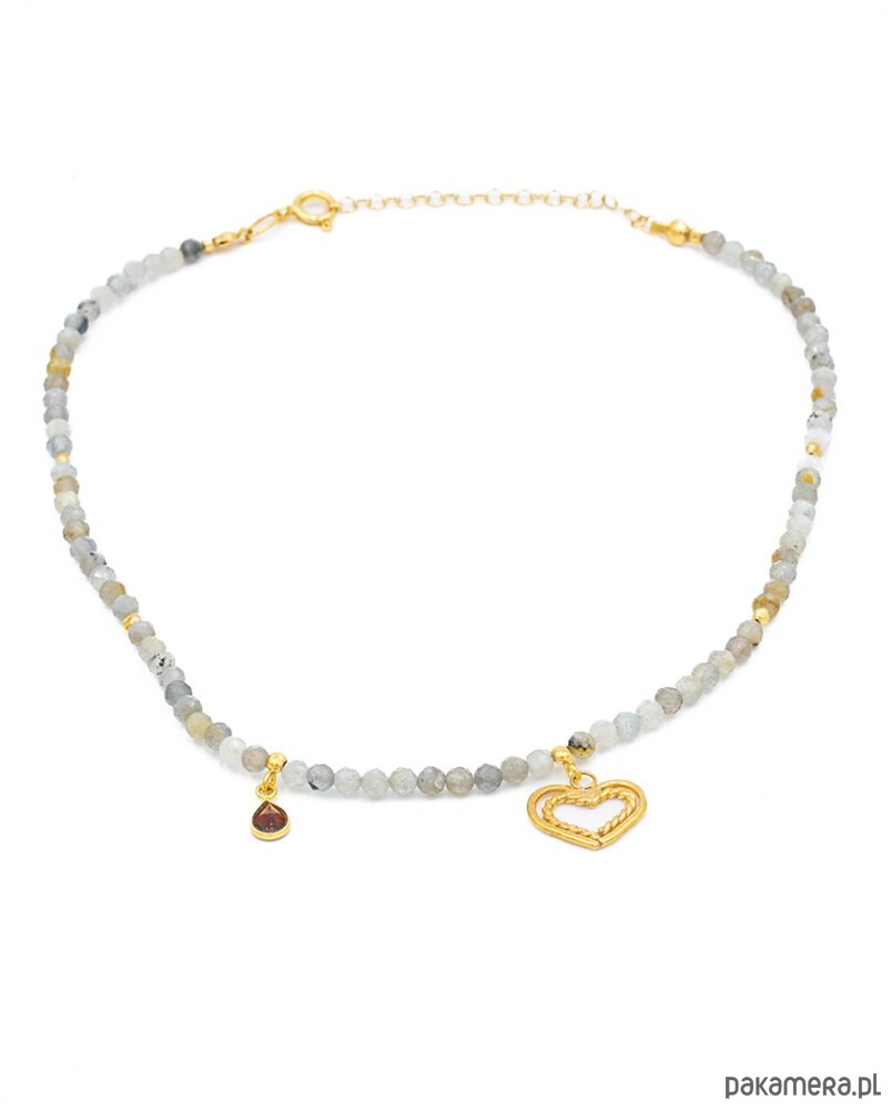Energetyczny naszyjnik z fasetowanymi kuleczkami labradorytu z przywieszonym granatem w złoconej oprawie oraz ręcznie wykonanym serduszkiem. Całość wykonana ze srebra 925, złoconego 24k złotem.