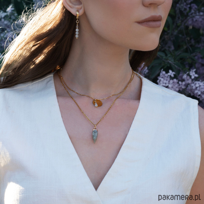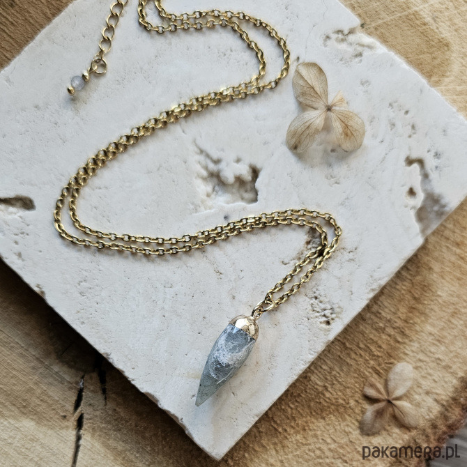 Modny naszyjnik wpisujący się w uwielbiany styl boho! Łańcuszek ze stali szlachetnej w kolorze złotym ozdobiony został labradorytem w kształcie grota. Jasnoszary minerał poprzecinany jest białymi fragmentami naturalnego wybarwienia, tworząc jedyną w swoim rodzaju mozaikę. Dodatkowo naszyjnik posiada łańcuszek regulacyjny, zakończony zawieszką z labradorytem. Świetnie sprawdzi się jako prezent.