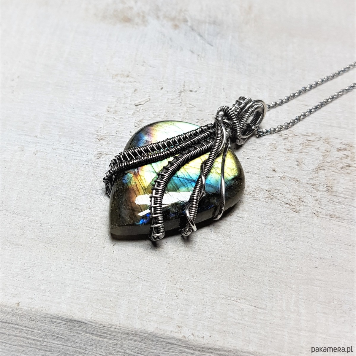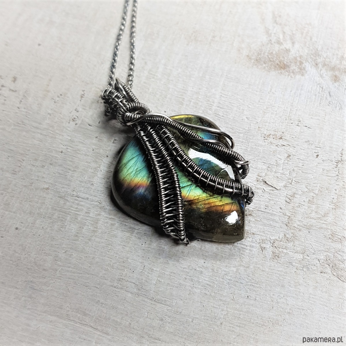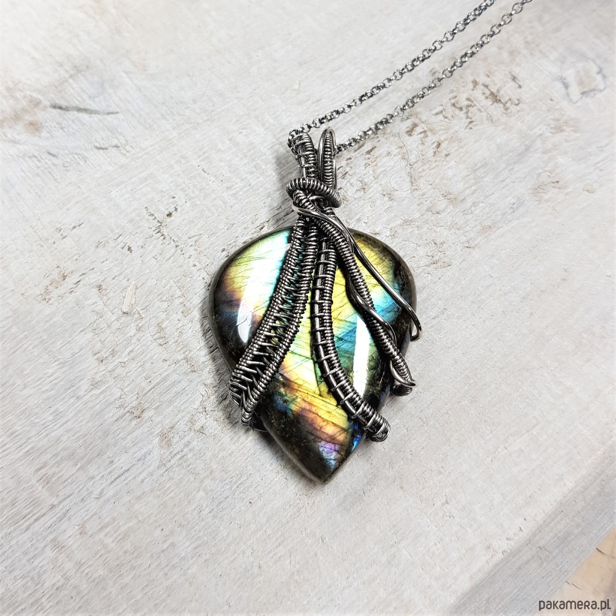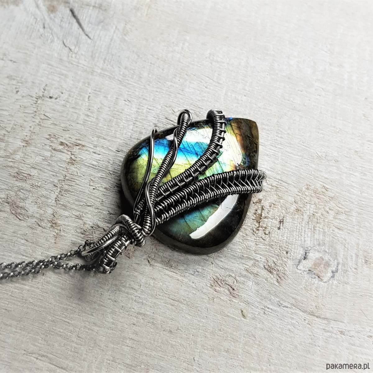 Zawieszka wykonana ręcznie metodą wire-wrappingu której sercem jest naturalny, baśniowy labradoryt pięknie mieniący się wieloma kolorami. Naszyjnik pochodzi z kolekcji kolory marzeń. Do wykonania wisiorka użyto srebra najwyższej próby 999. Zawieszka przyciemniona i wypolerowana w celu uzyskania szlachetnego efektu postarzenia. Wymiary zawieszki 48x28mm z łańcuszkiem długości około 45-50 cm.