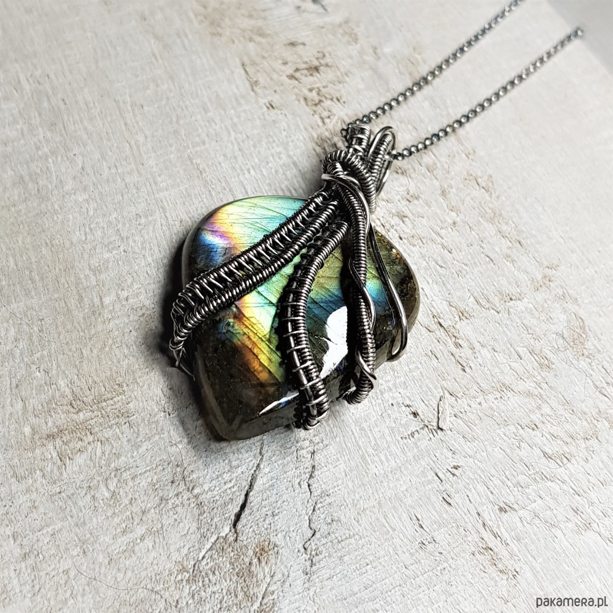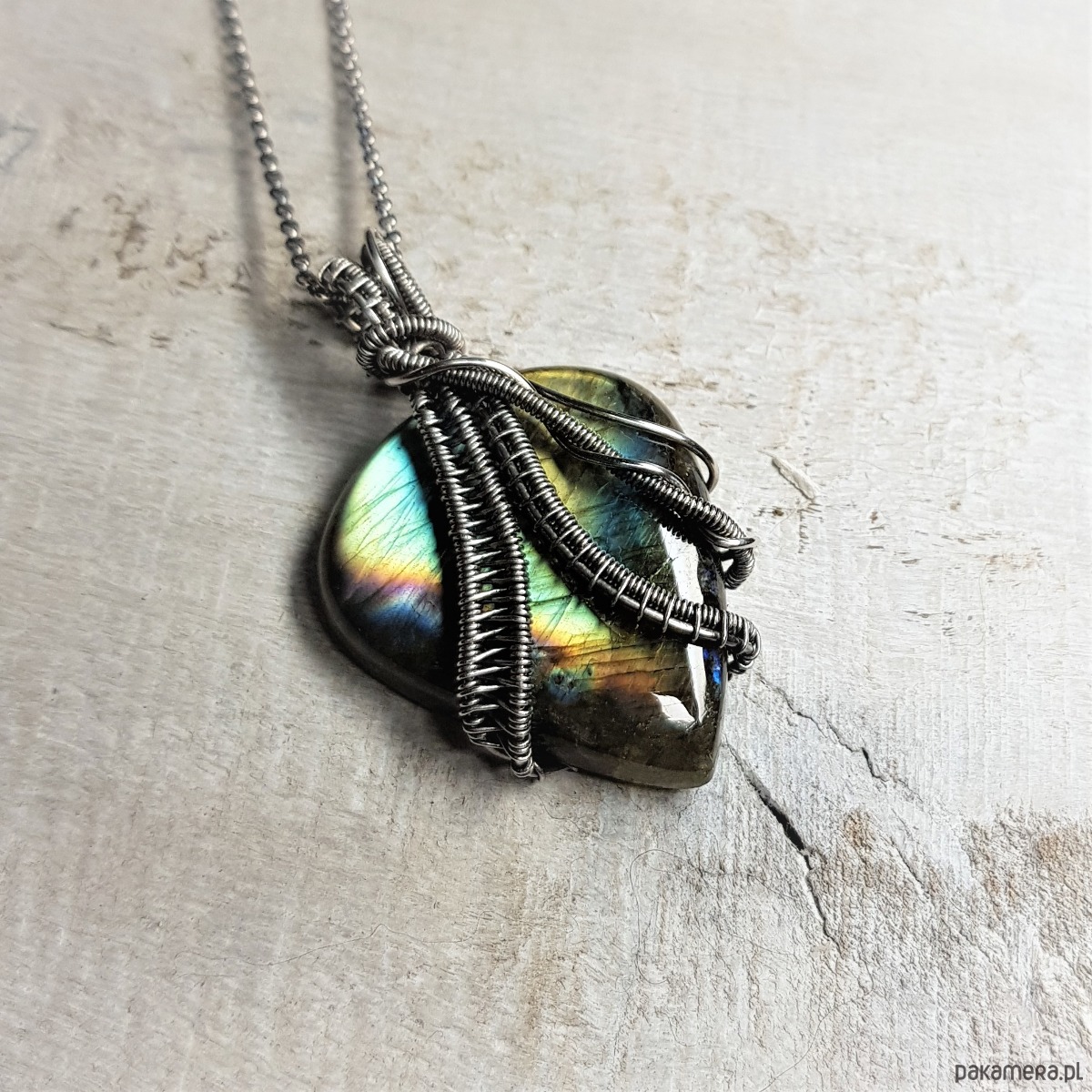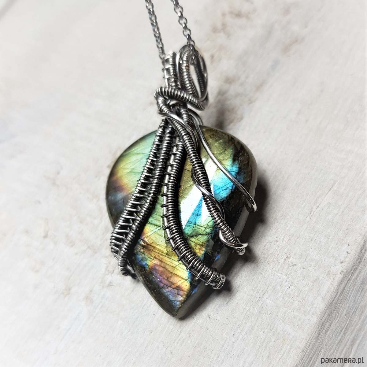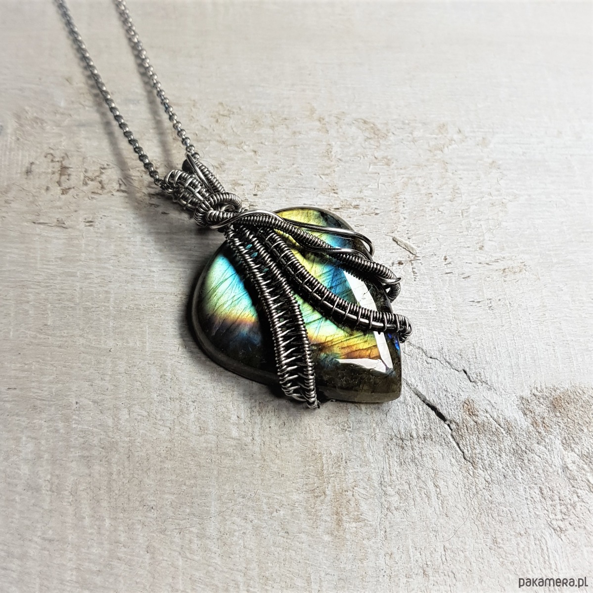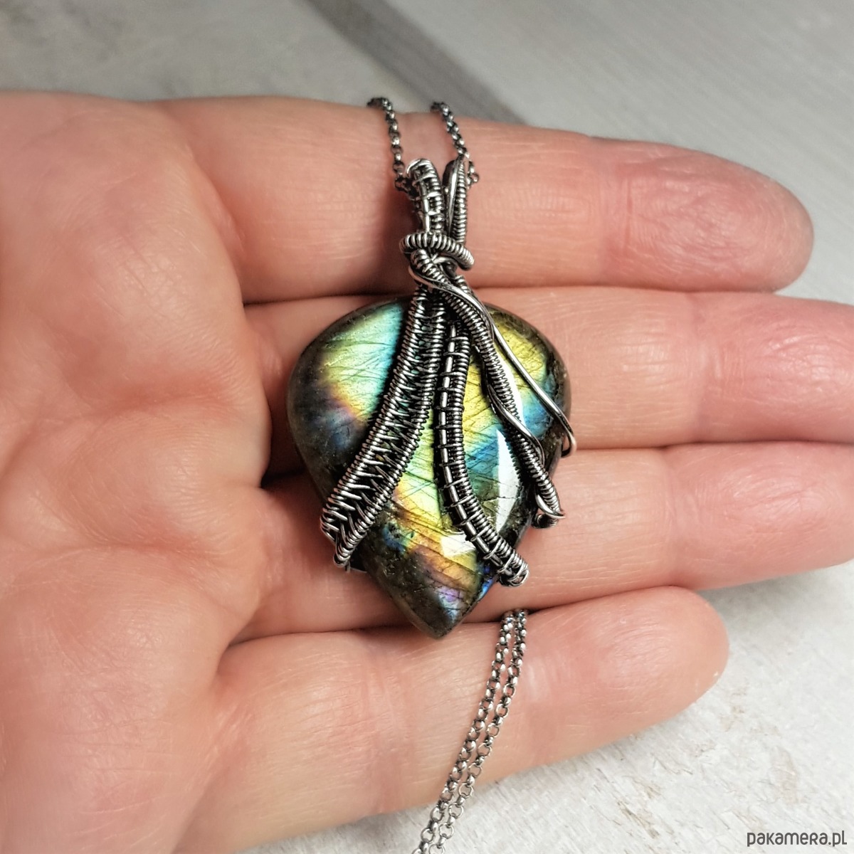 Zawieszka wykonana ręcznie metodą wire-wrappingu której sercem jest naturalny, baśniowy labradoryt pięknie mieniący się wieloma kolorami. Naszyjnik pochodzi z kolekcji kolory marzeń. Do wykonania wisiorka użyto srebra najwyższej próby 999. Zawieszka przyciemniona i wypolerowana w celu uzyskania szlachetnego efektu postarzenia. Wymiary zawieszki 48x28mm z łańcuszkiem długości około 45-50 cm.