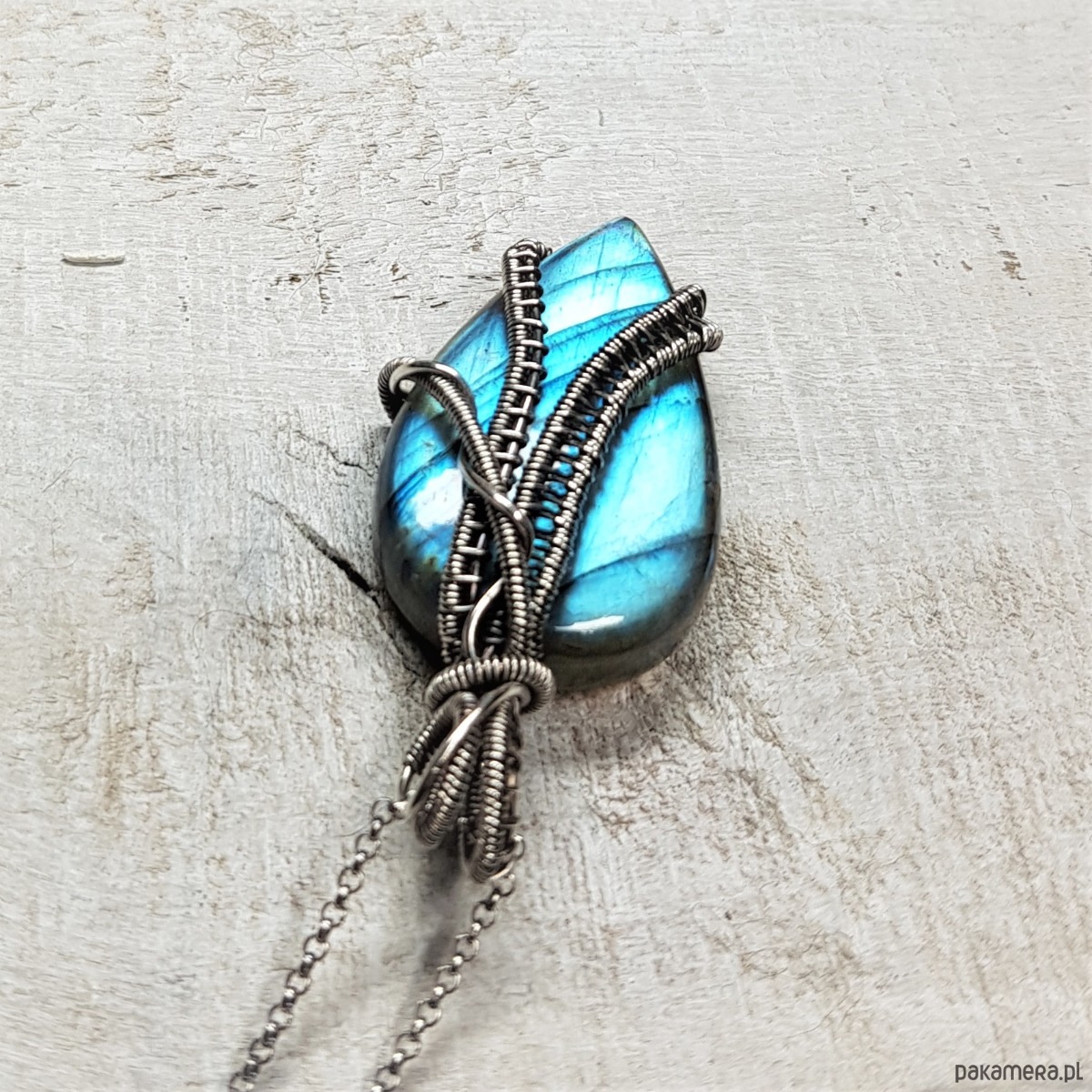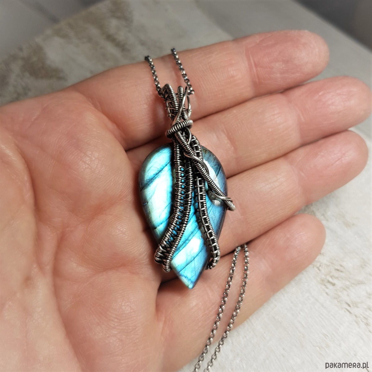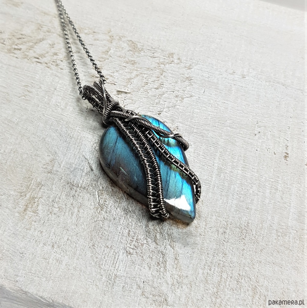 Zawieszka wykonana ręcznie metodą wire-wrappingu której sercem jest naturalny, baśniowy labradoryt pięknie mieniący się błękitami i odrobiną miodu i oliwki. Naszyjnik pochodzi z kolekcji kolory marzeń. Do wykonania wisiorka użyto srebra najwyższej próby 999. Zawieszka przyciemniona i wypolerowana w celu uzyskania szlachetnego efektu postarzenia. Wymiary zawieszki 52x24mm z łańcuszkiem długości około 45-50 cm.
