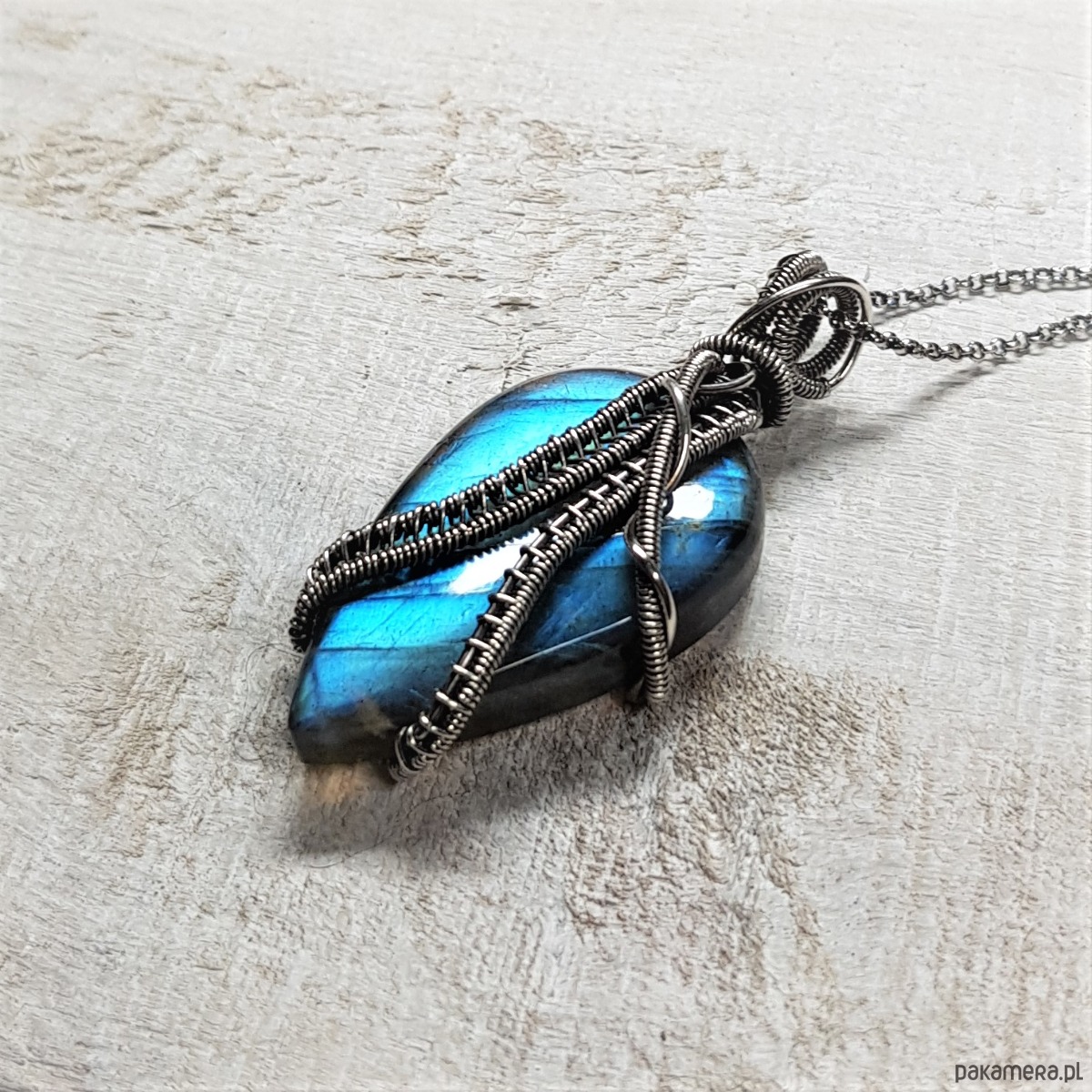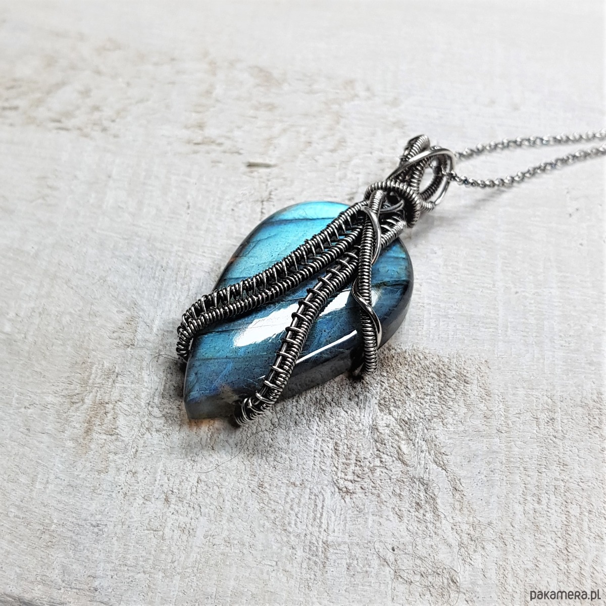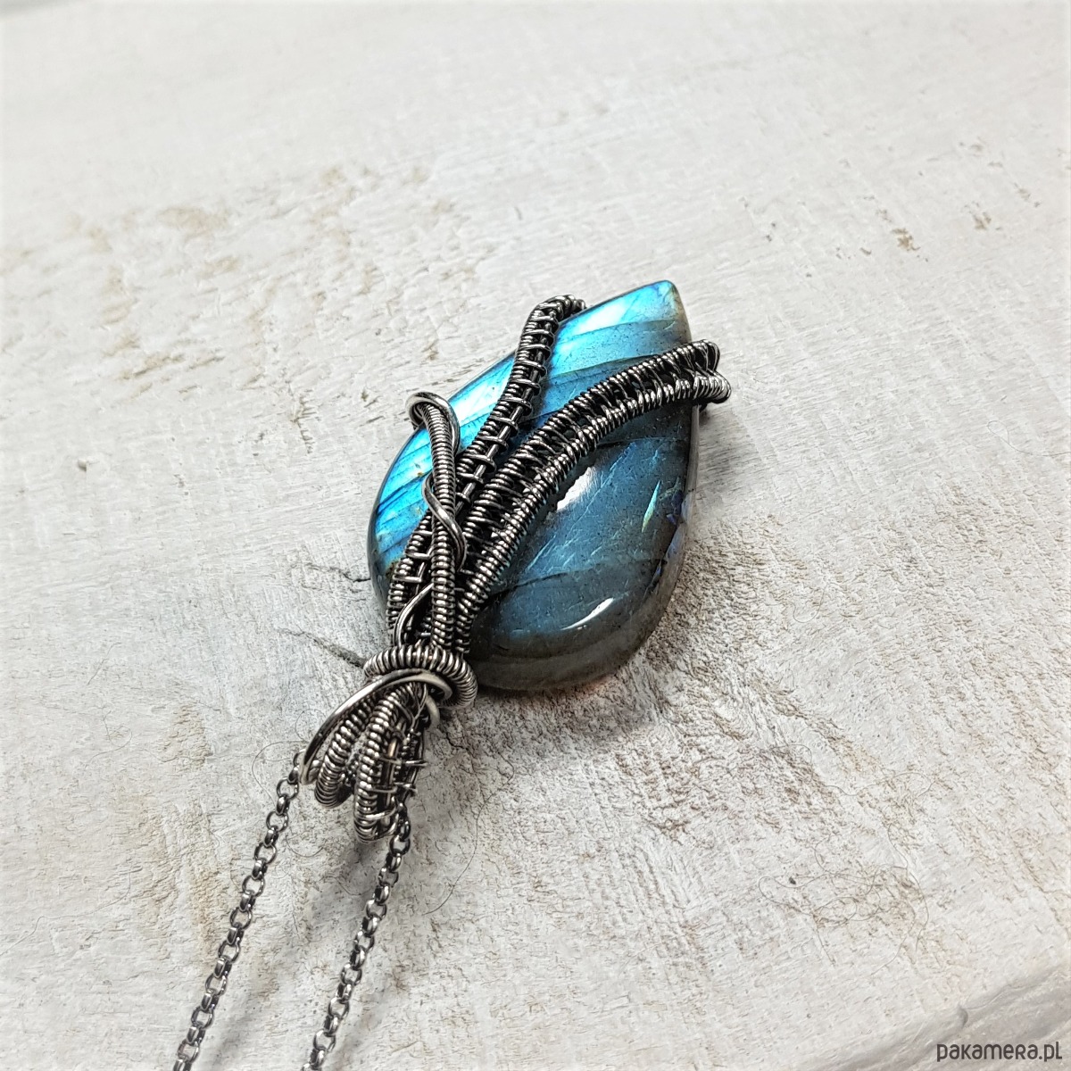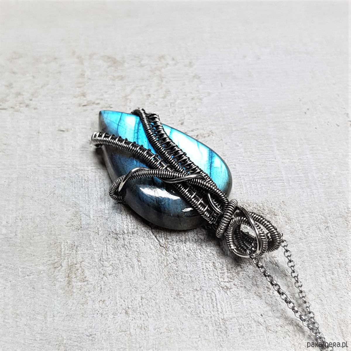 Zawieszka wykonana ręcznie metodą wire-wrappingu której sercem jest naturalny, baśniowy labradoryt pięknie mieniący się błękitami i odrobiną miodu i oliwki. Naszyjnik pochodzi z kolekcji kolory marzeń. Do wykonania wisiorka użyto srebra najwyższej próby 999. Zawieszka przyciemniona i wypolerowana w celu uzyskania szlachetnego efektu postarzenia. Wymiary zawieszki 52x24mm z łańcuszkiem długości około 45-50 cm.