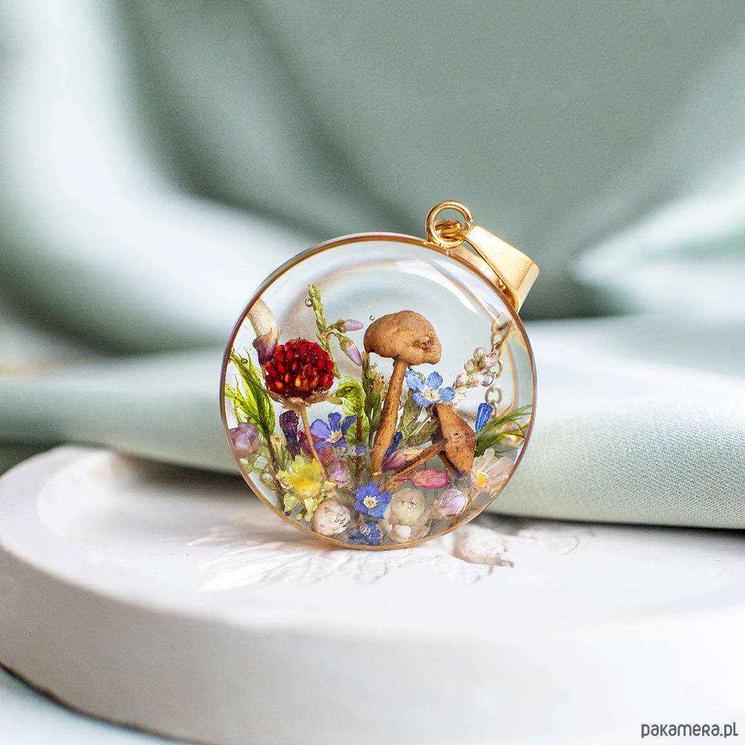 Wisiorek wykonany jest z żywicy epoksydowej z wykorzystaniem suszonych kwiatów. Metalowe elementy to stal nierdzewna szlachetna chirurgiczna.