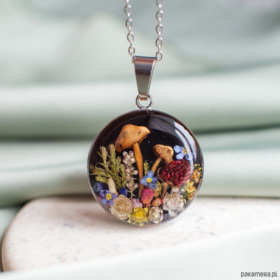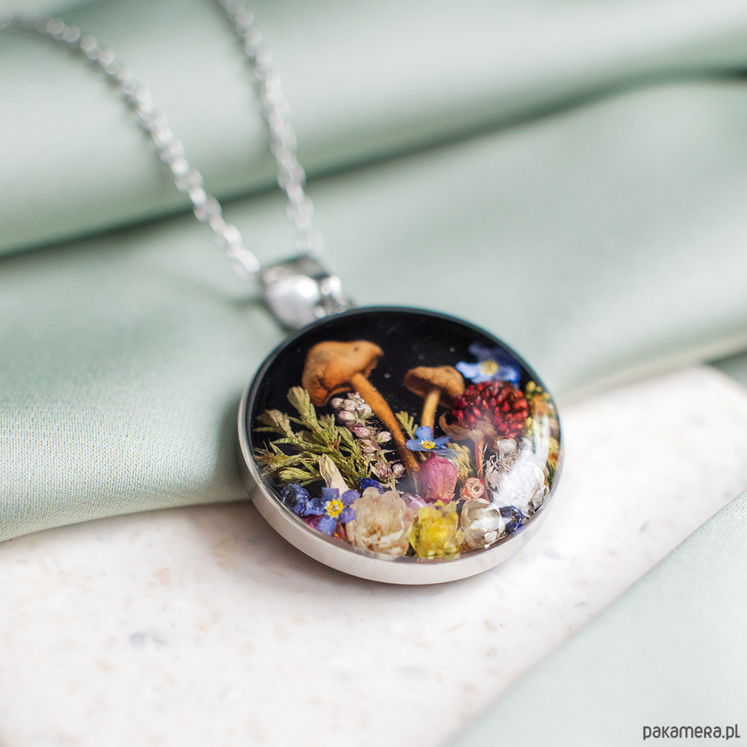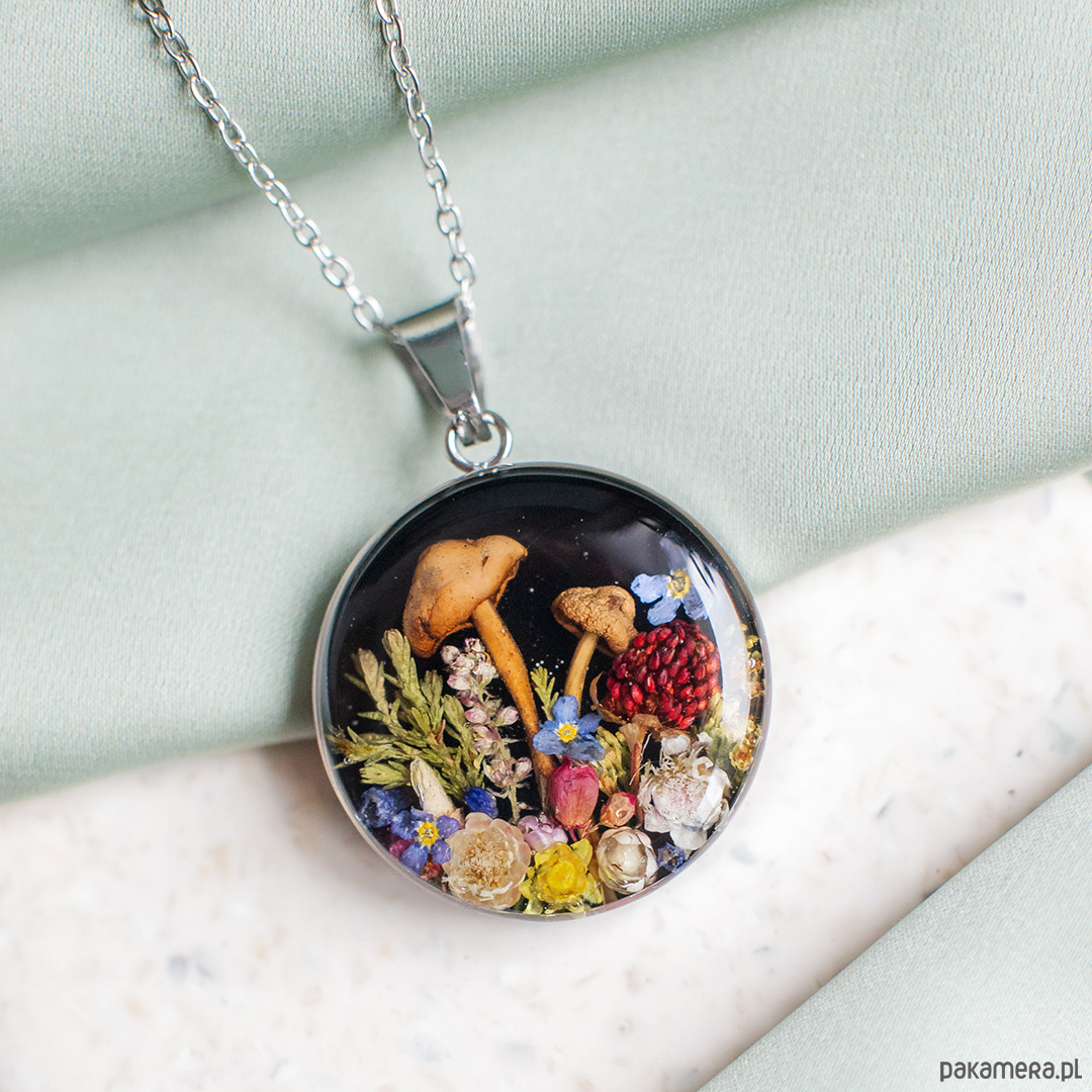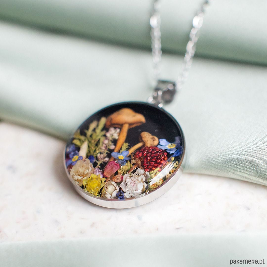 Wisiorek wykonany jest z żywicy epoksydowej z wykorzystaniem suszonych kwiatów. Metalowe elementy to stal nierdzewna szlachetna chirurgiczna.