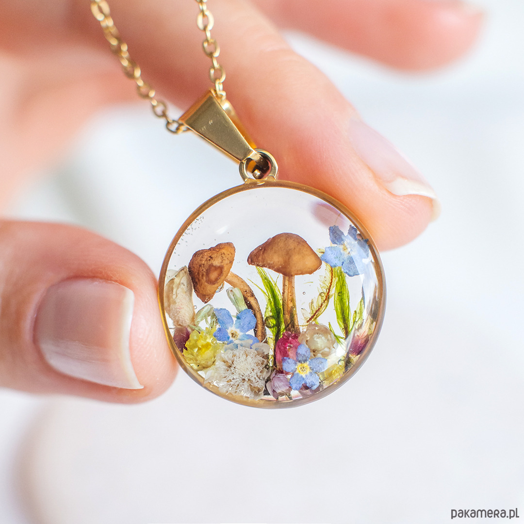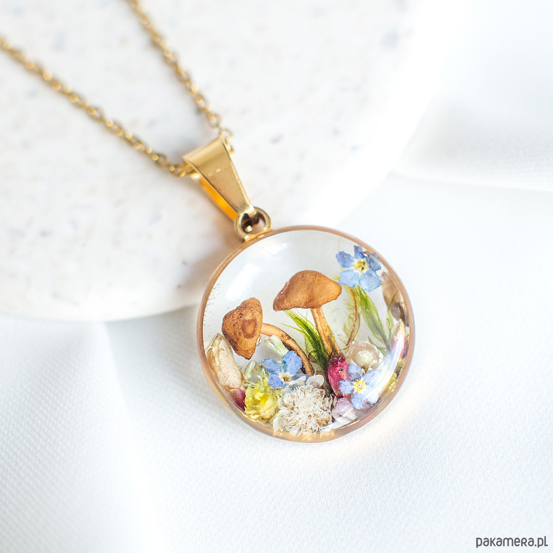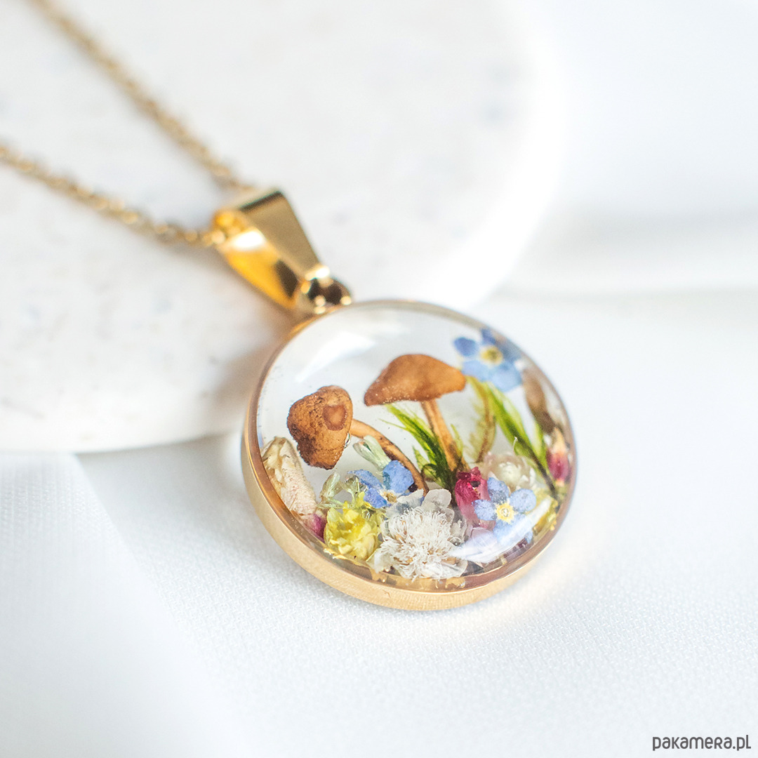 Wisiorek wykonany jest z żywicy epoksydowej z wykorzystaniem suszonych kwiatów. Metalowe elementy to stal nierdzewna szlachetna chirurgiczna.