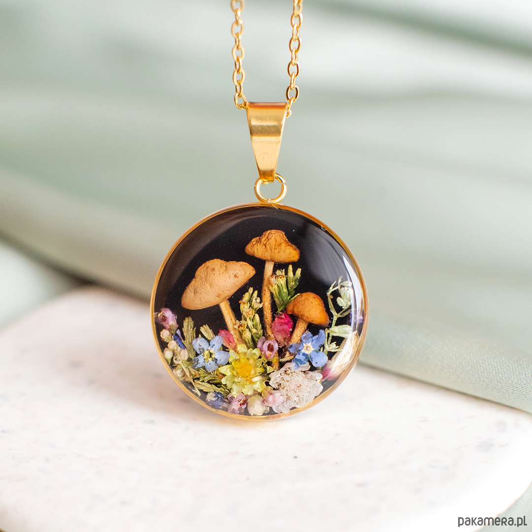 Wisiorek wykonany jest z żywicy epoksydowej z wykorzystaniem suszonych kwiatów. Metalowe elementy to stal nierdzewna szlachetna chirurgiczna.