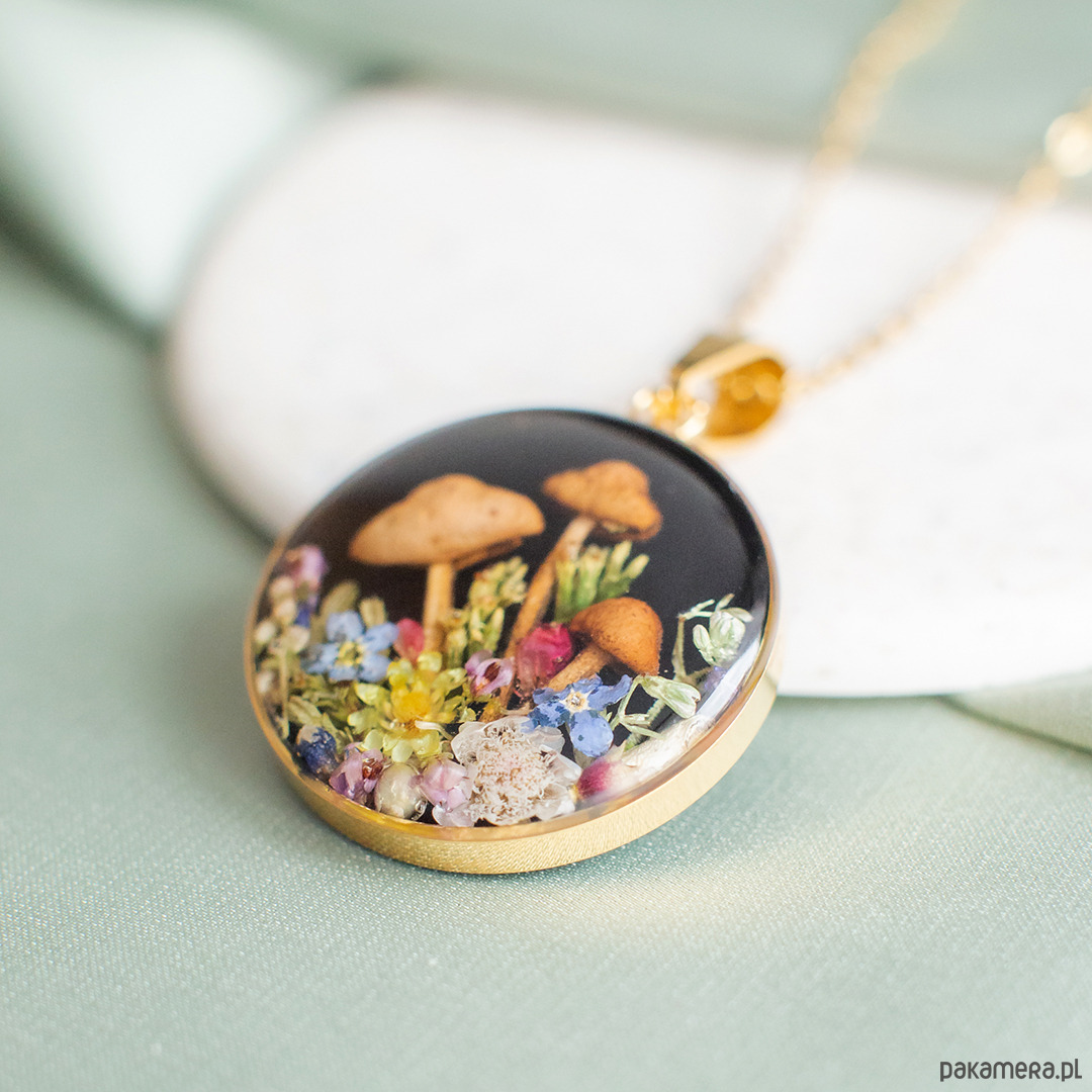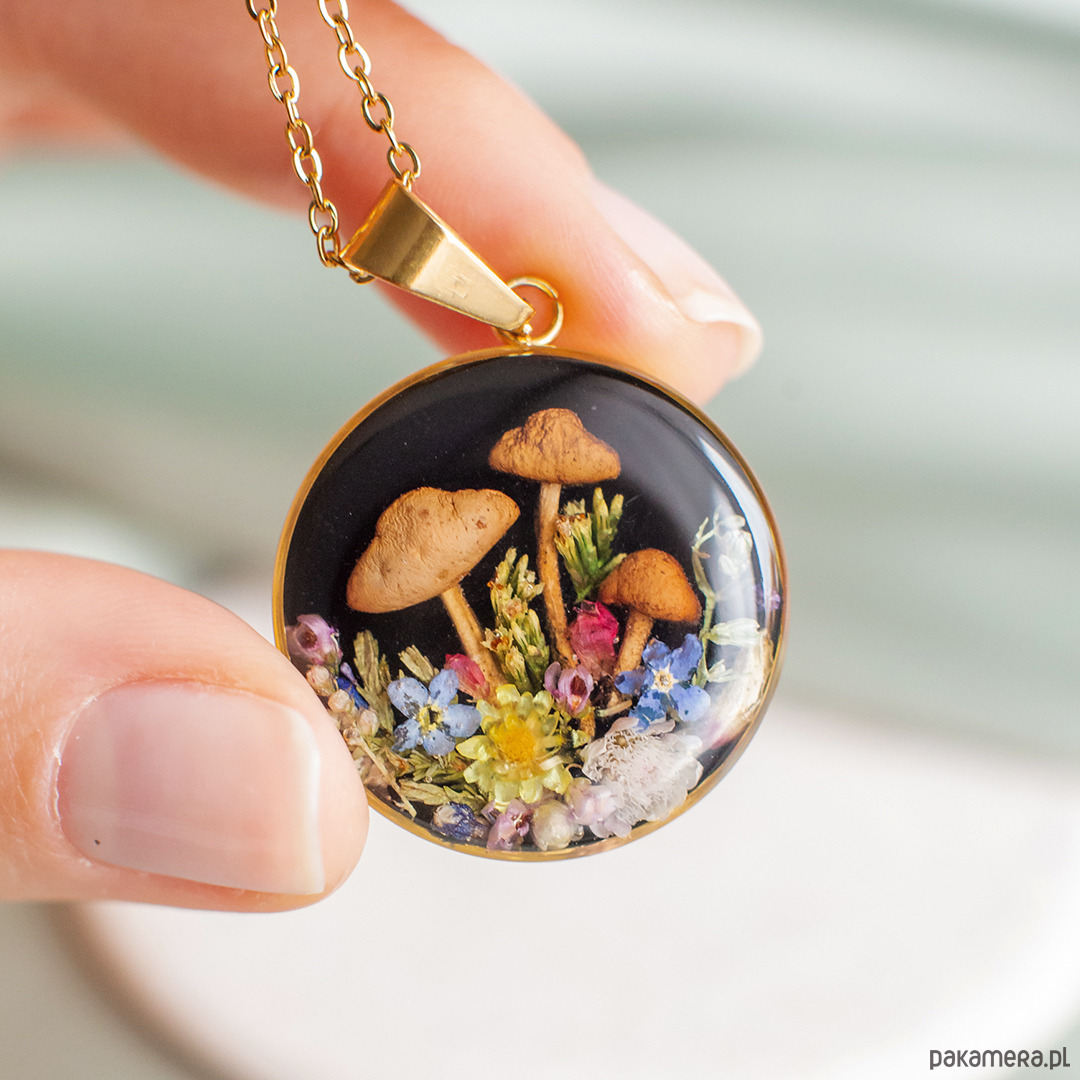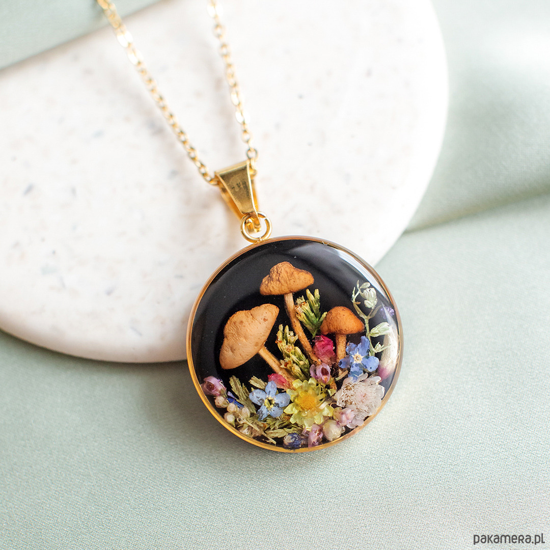 Wisiorek wykonany jest z żywicy epoksydowej z wykorzystaniem suszonych kwiatów. Metalowe elementy to stal nierdzewna szlachetna chirurgiczna.