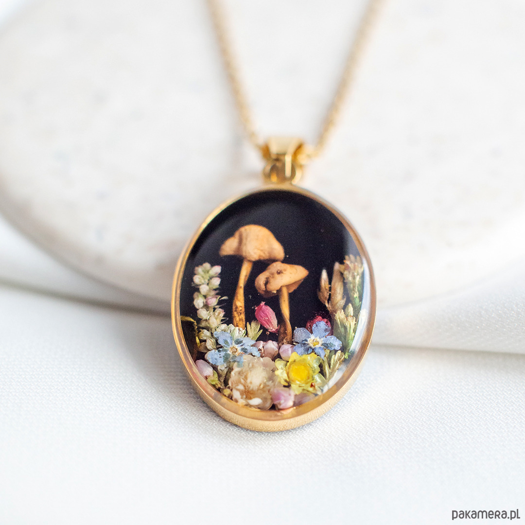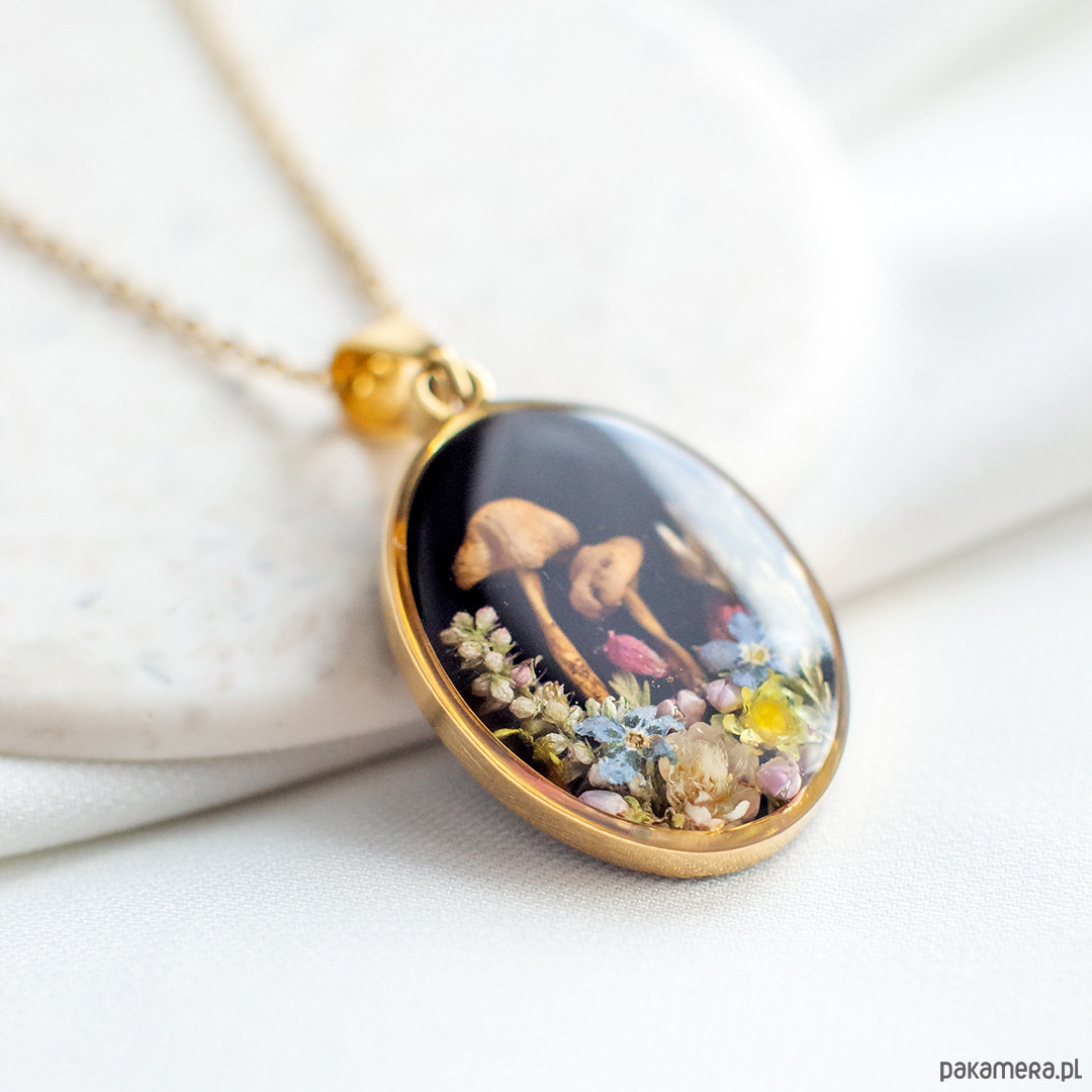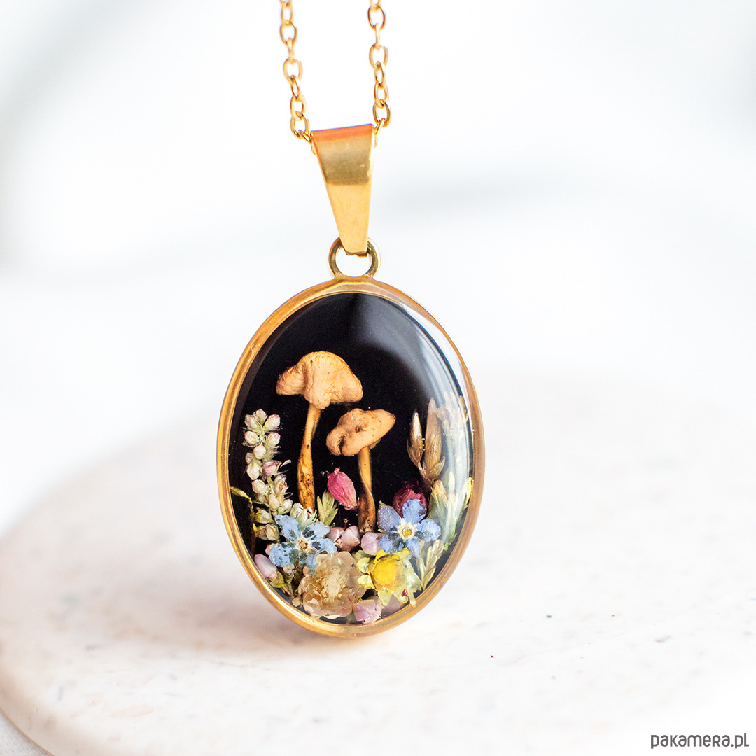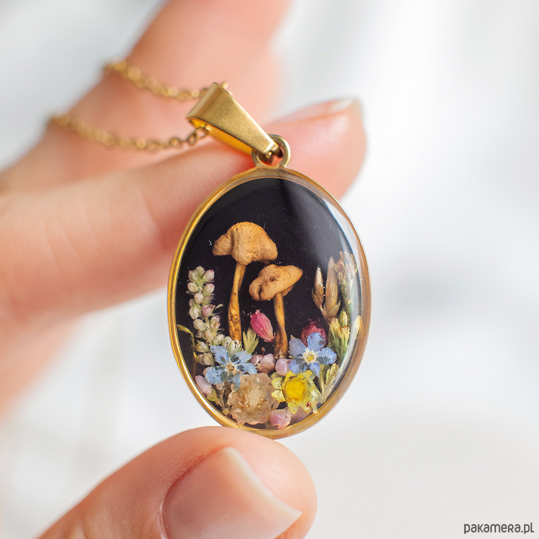 Wisiorek wykonany jest z żywicy epoksydowej z wykorzystaniem suszonych kwiatów. Metalowe elementy to stal nierdzewna szlachetna chirurgiczna.