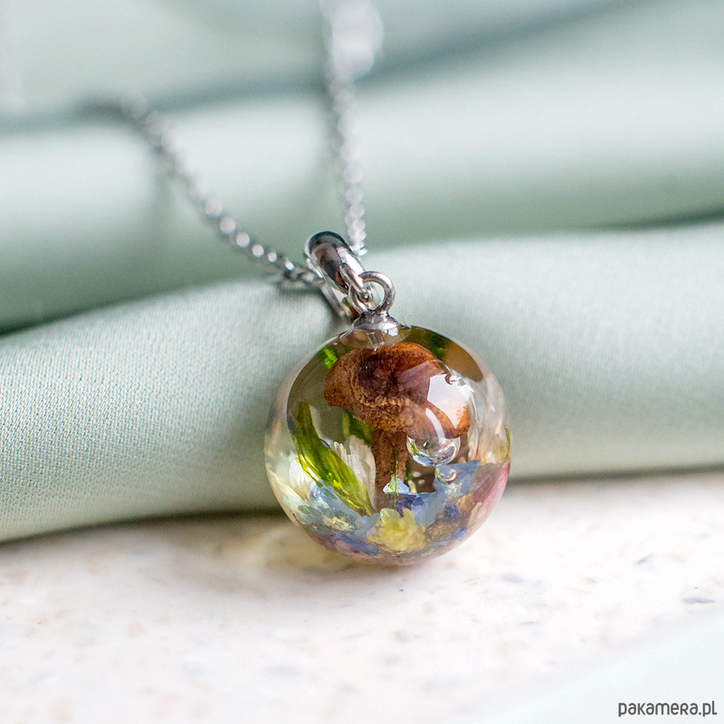 Wisiorek wykonany jest z żywicy epoksydowej z wykorzystaniem suszonych kwiatów. Metalowe elementy to stal nierdzewna szlachetna chirurgiczna.
