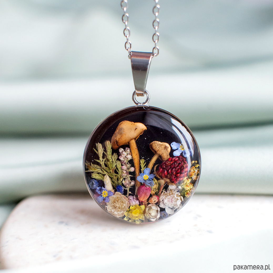 Wisiorek wykonany jest z żywicy epoksydowej z wykorzystaniem suszonych kwiatów. Metalowe elementy to stal nierdzewna szlachetna chirurgiczna.