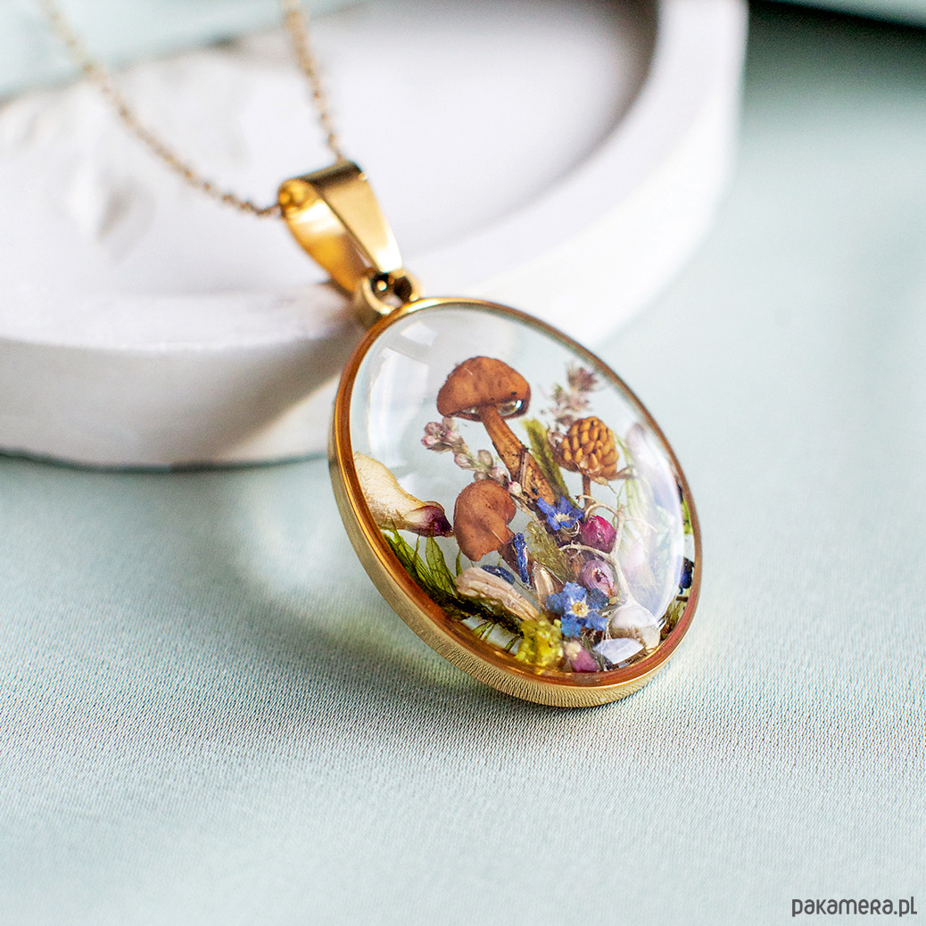 Wisiorek wykonany jest z żywicy epoksydowej z wykorzystaniem suszonych kwiatów. Metalowe elementy to stal nierdzewna szlachetna chirurgiczna.
