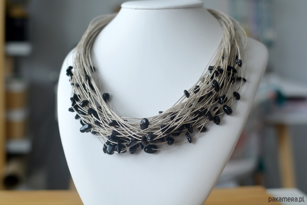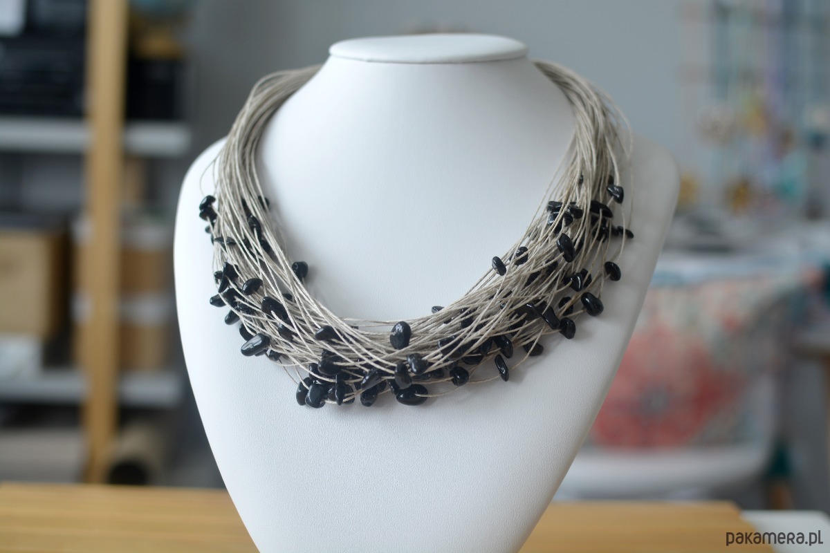 Naszyjnik wykonany z wyprodukowanego w Polsce, wysokogatunkowego lnu w kolorze naturalnym oraz z dużej ilości bryłek czarnego agatu. Stosowane przez nas nici lniane są nabłyszczane, co oznacza, że mają powłokę, która sprawia, że nić jest sztywniejsza, wytrzymalsza oraz nie absorbuje tak wody. Naszyjnik został wykończony elementami metalowymi ze stali szlachetnej a zapinany jest na karabińczyk.
