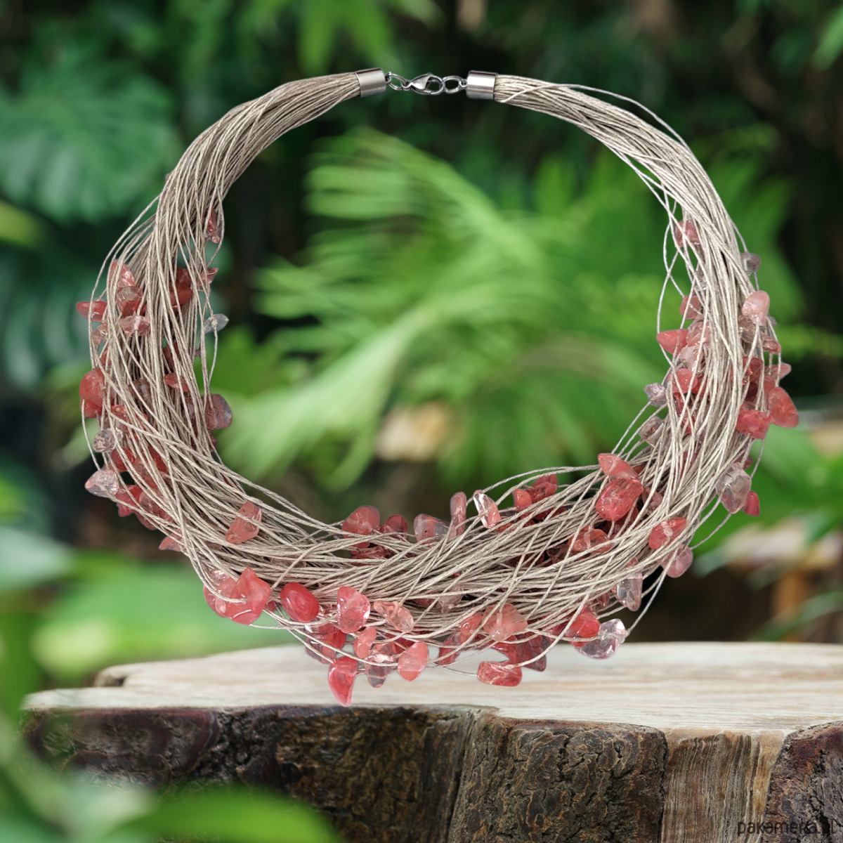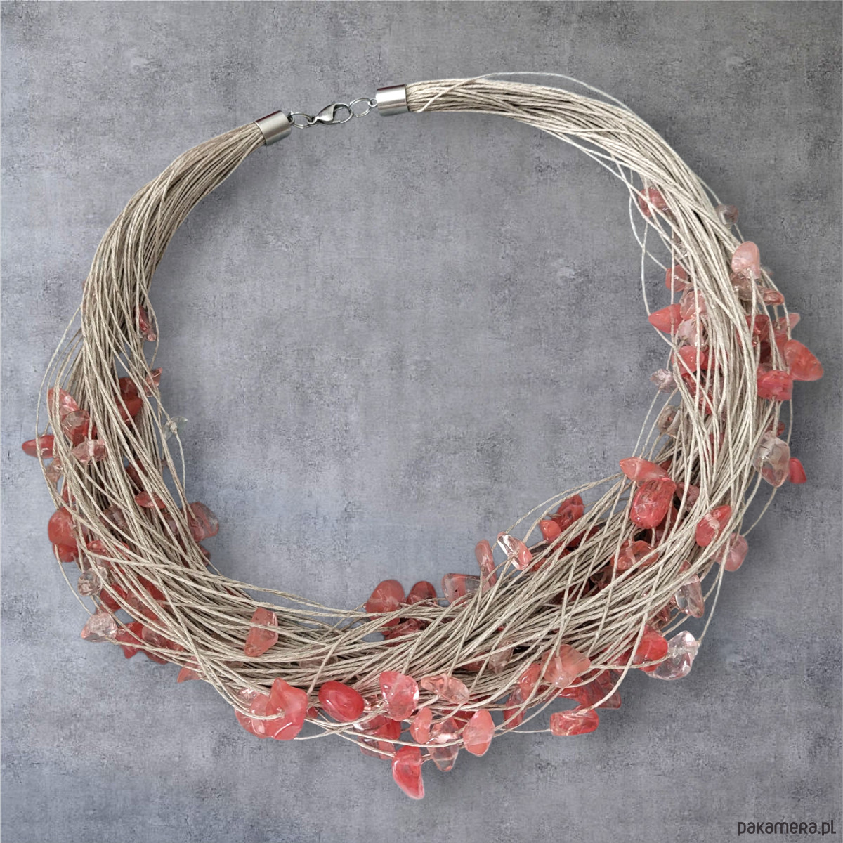 Naszyjnik wykonany z wyprodukowanego w Polsce, wysokogatunkowego lnu w kolorze naturalnym oraz z dużej ilości bryłek kwarcu arbuziego. Stosowane przez nas nici lniane są nabłyszczane, co oznacza, że mają powłokę, która sprawia, że nić jest sztywniejsza, wytrzymalsza oraz nie absorbuje tak wody. Naszyjnik został wykończony elementami metalowymi ze stali szlachetnej a zapinany jest na karabińczyk.