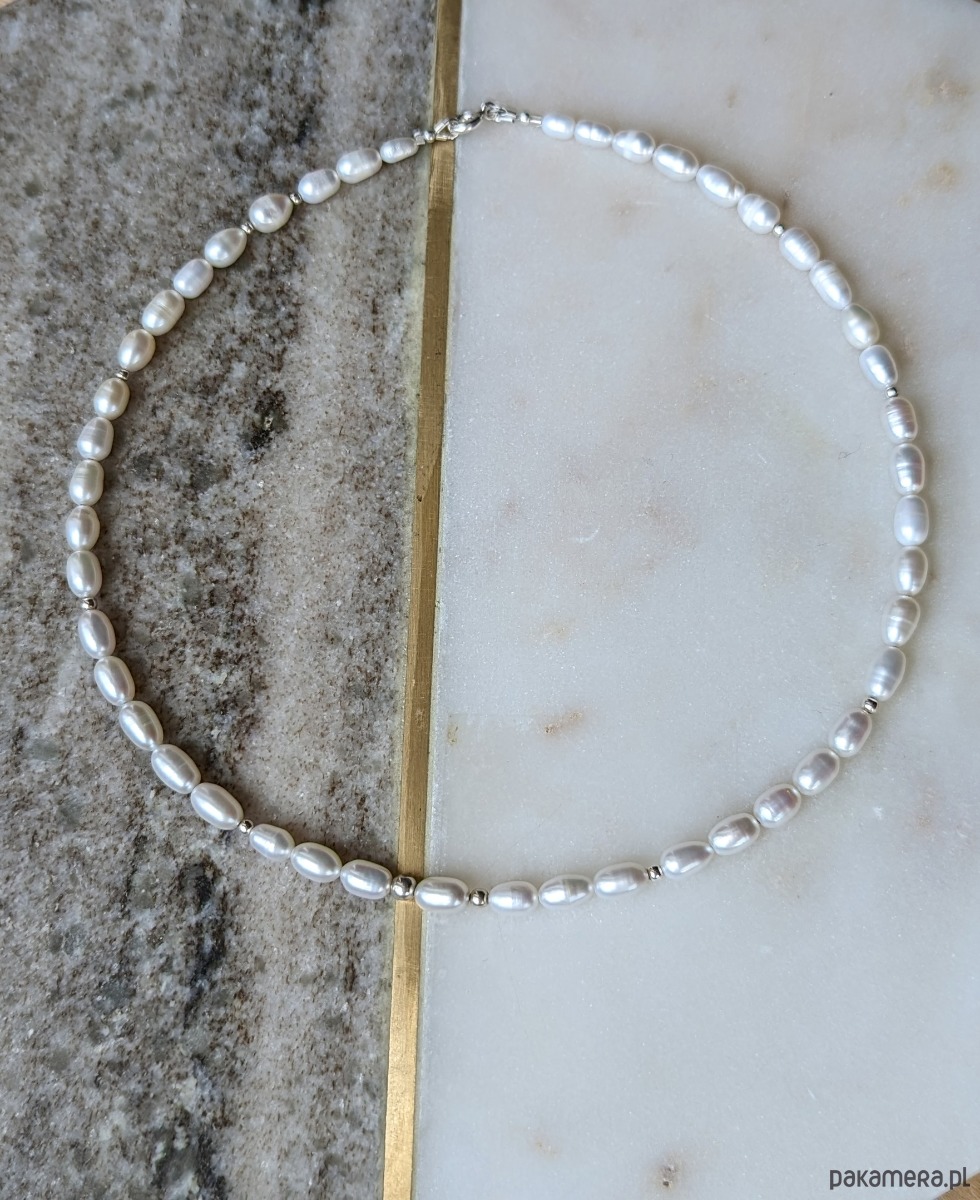 Sznur białych pereł z delikatnymi akcentami ze srebra. Perły pięknie lśnią, są lekko podłużne, smukłe. Wplecione srebrne kulki mają różną wielkość, delikatnie zaburzając symetrię. Minimalistyczna, a zarazem klasyczna wersja perłowego naszyjnika. Polecam ze względu na jakość pereł, które są gładkie i ślicznie odbijają światło.