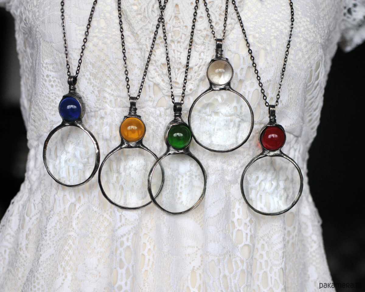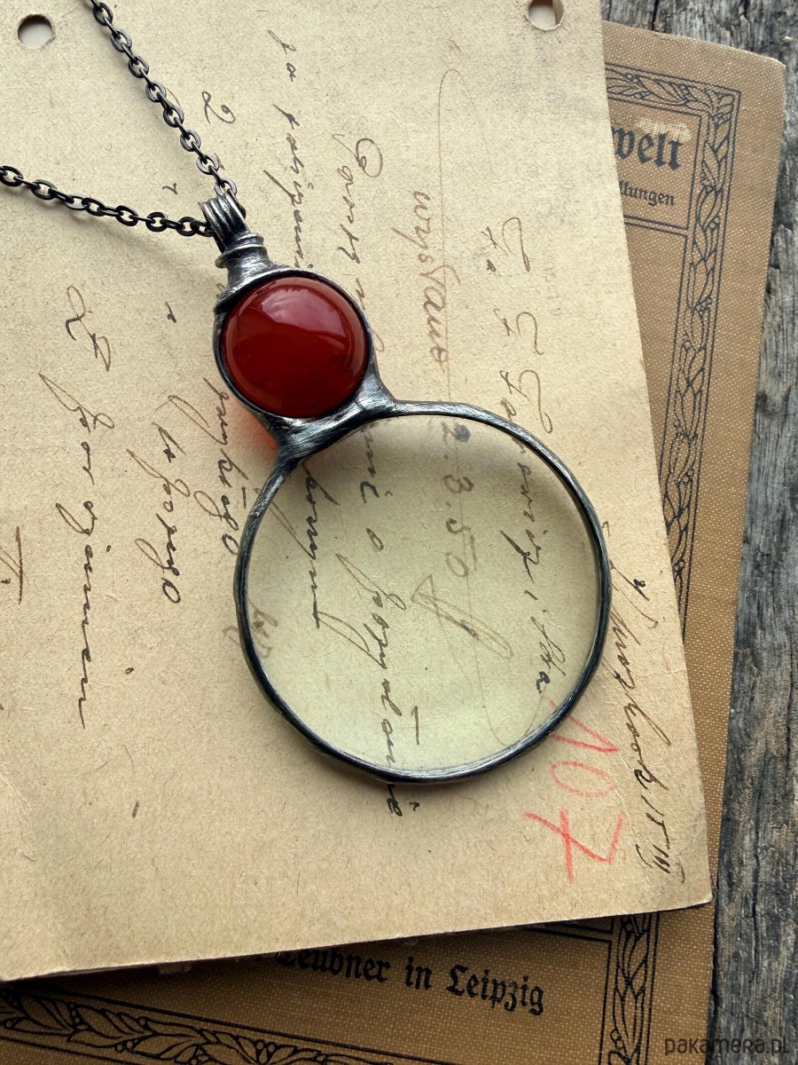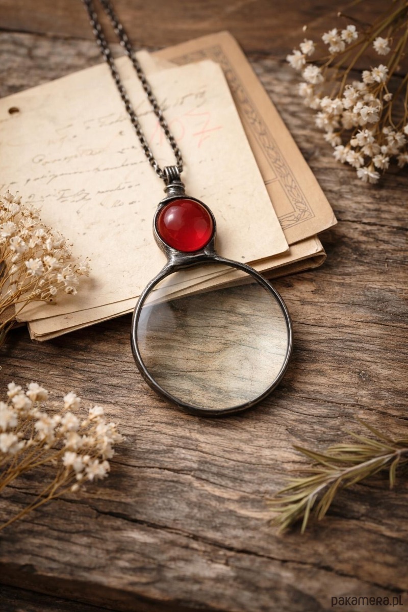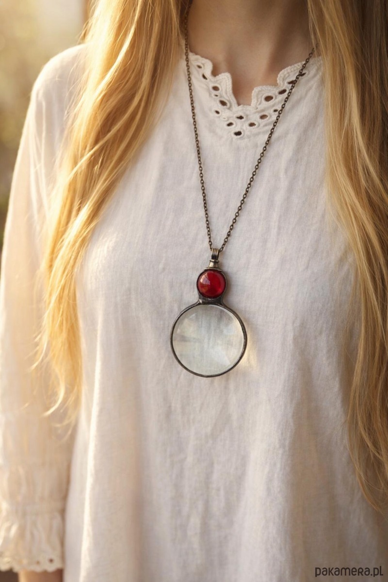 Lupka oprawiona jest w cynowaną ramę o wyglądzie starego srebra. Całość została uzupełniona szklaną kuleczką w intensywnym czerwonym kolorze, która pięknie odbija światło i nadaje biżuterii charakteru.