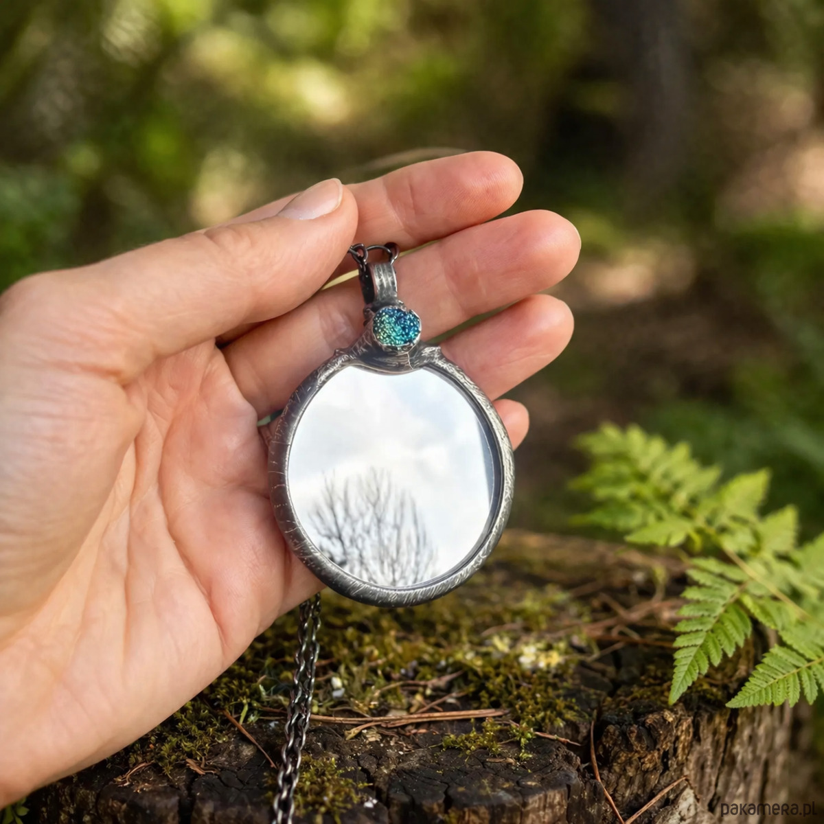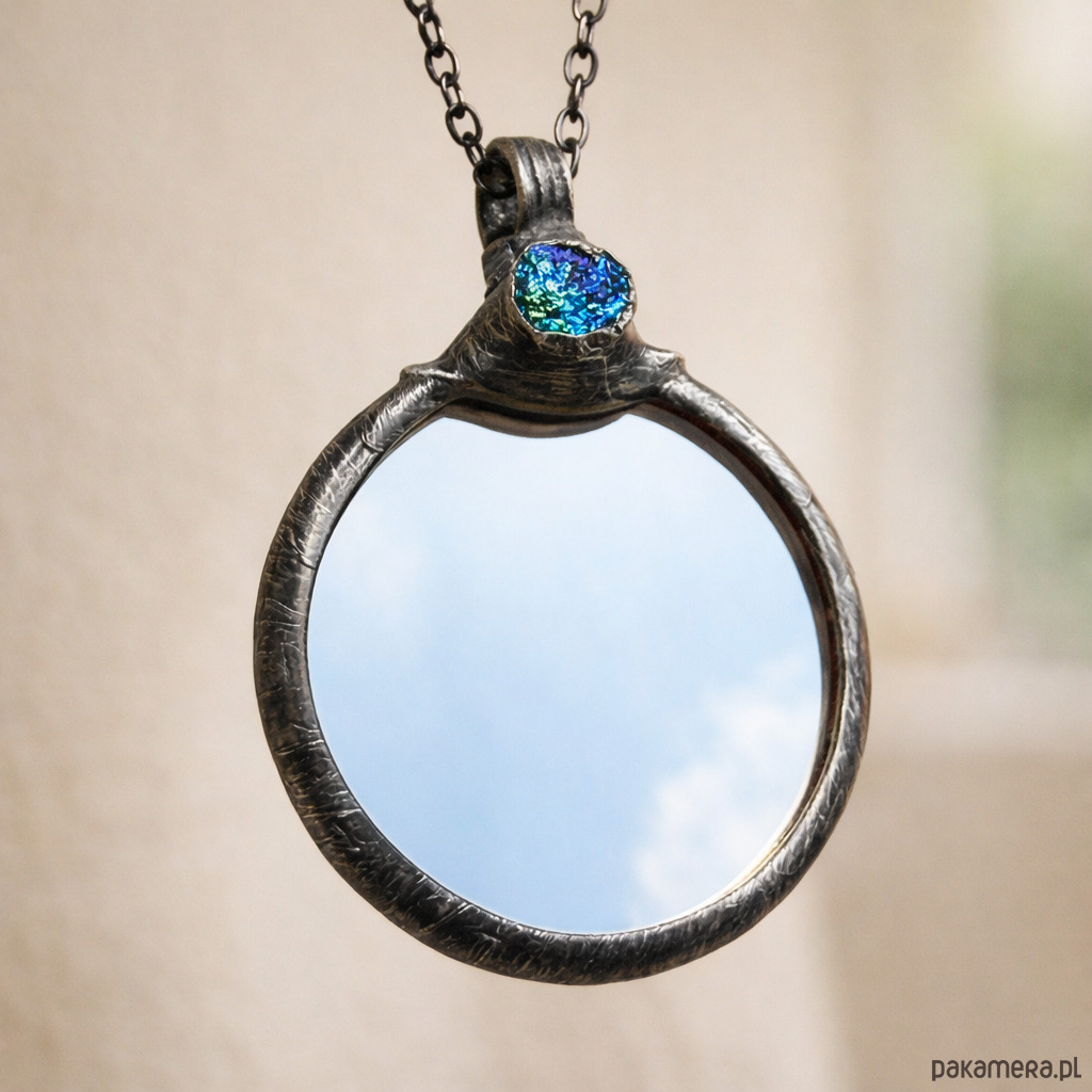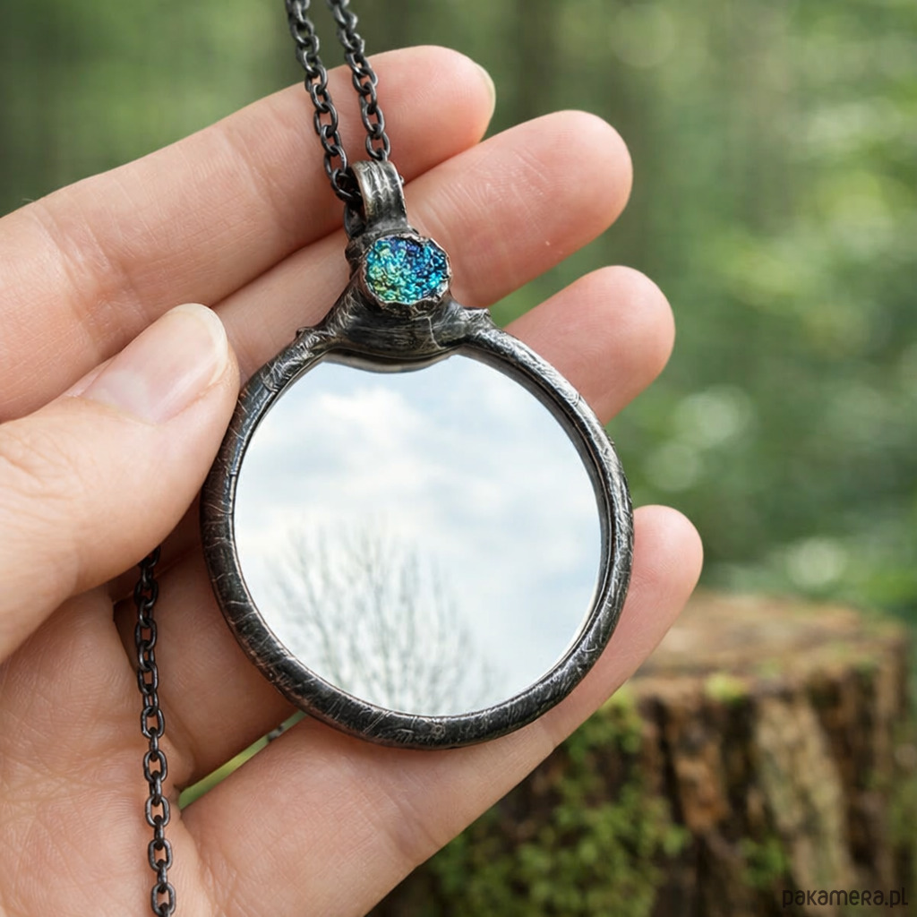 Okrągły wisiorek o średnicy około 4 cm łączy w sobie prawdziwe szkło oraz naturalny kamień o surowej, krystalicznej strukturze. Lusterko subtelnie odbija światło, a druza dodaje faktury i lekko połyskującego akcentu.