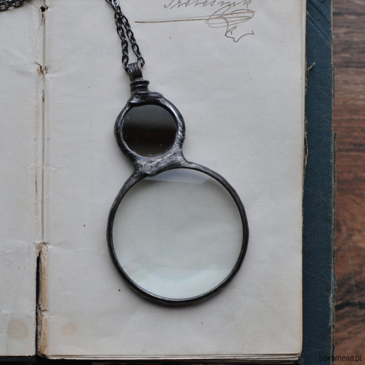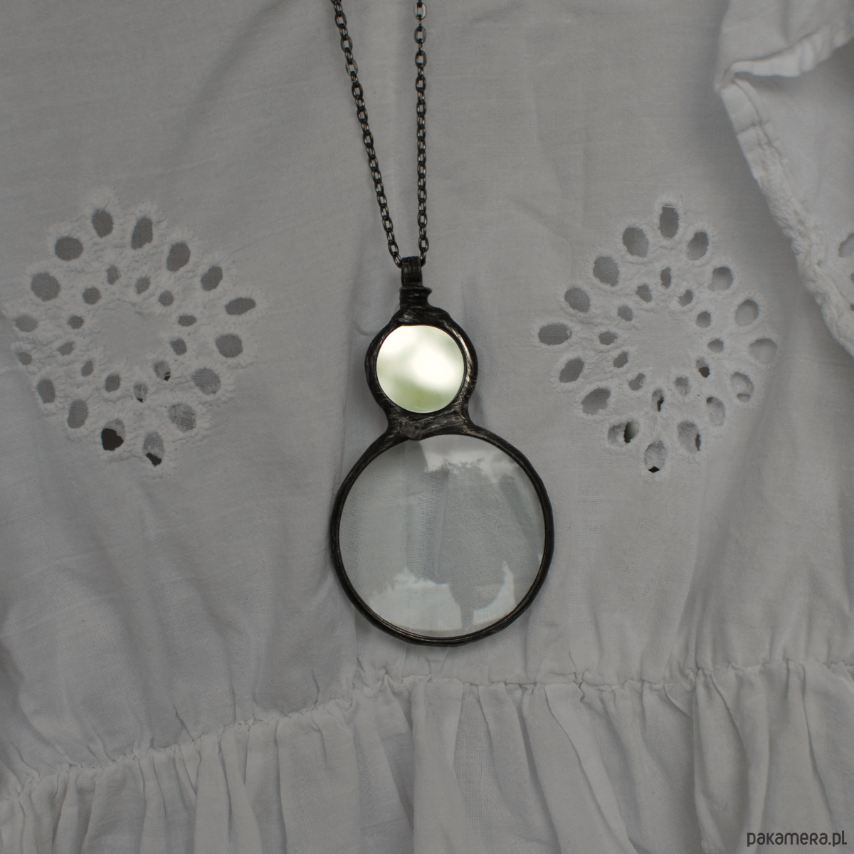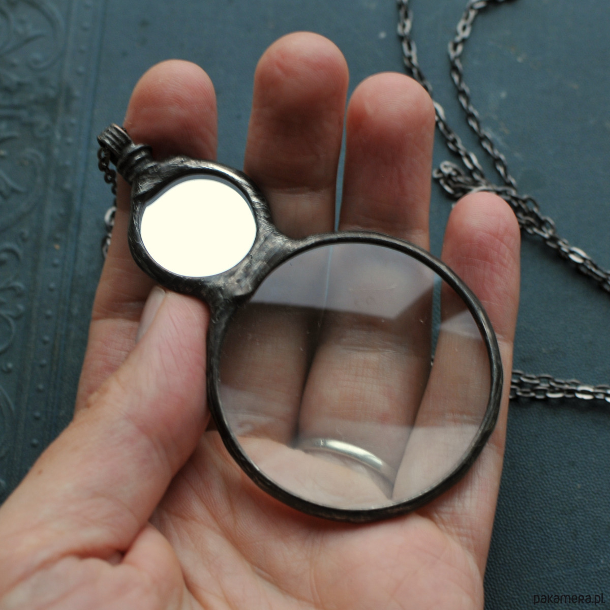 U góry naszyjnika znajduje małe lusterko, a pod nim szkło powiększające.