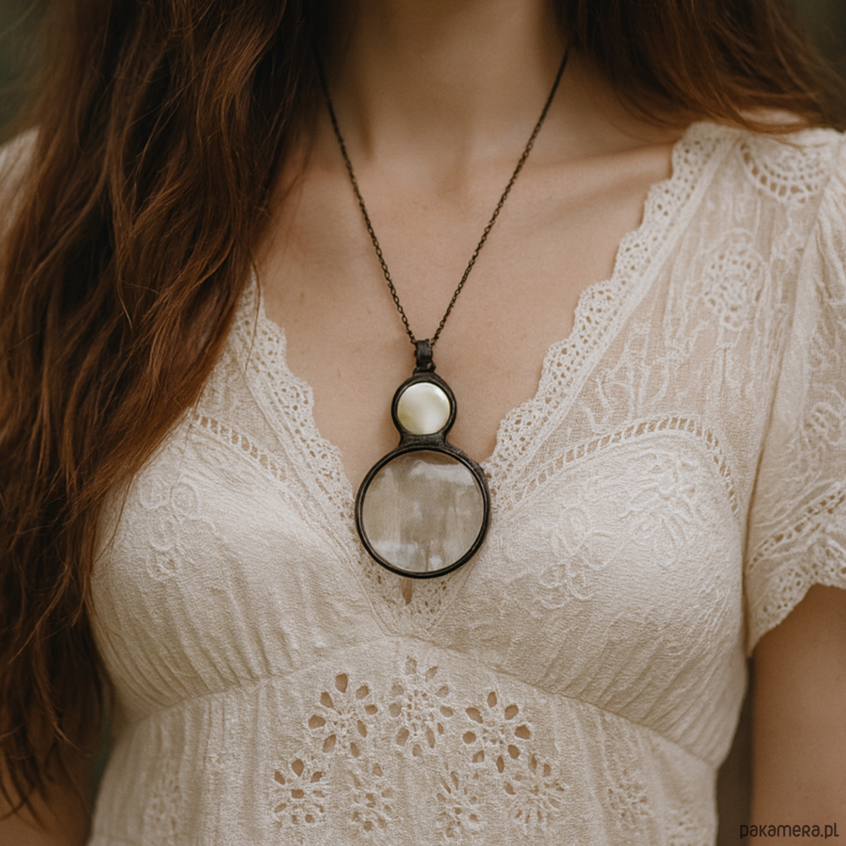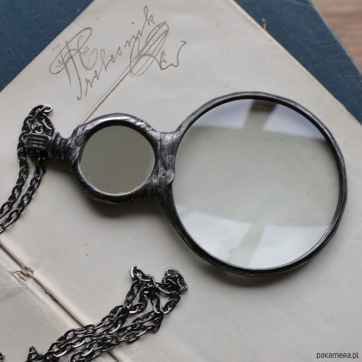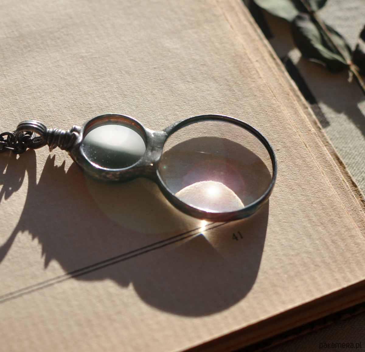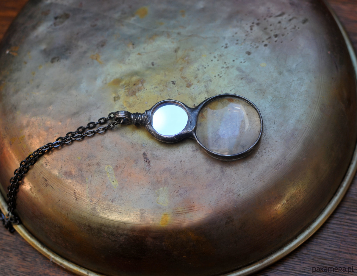 U góry naszyjnika znajduje małe lusterko, a pod nim szkło powiększające.