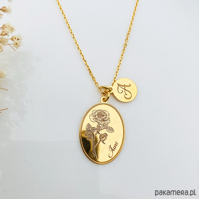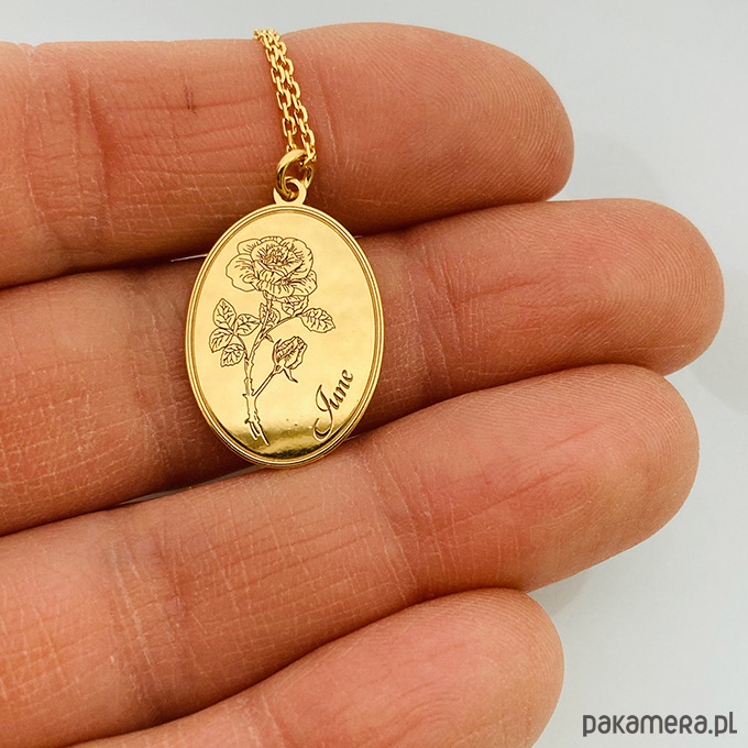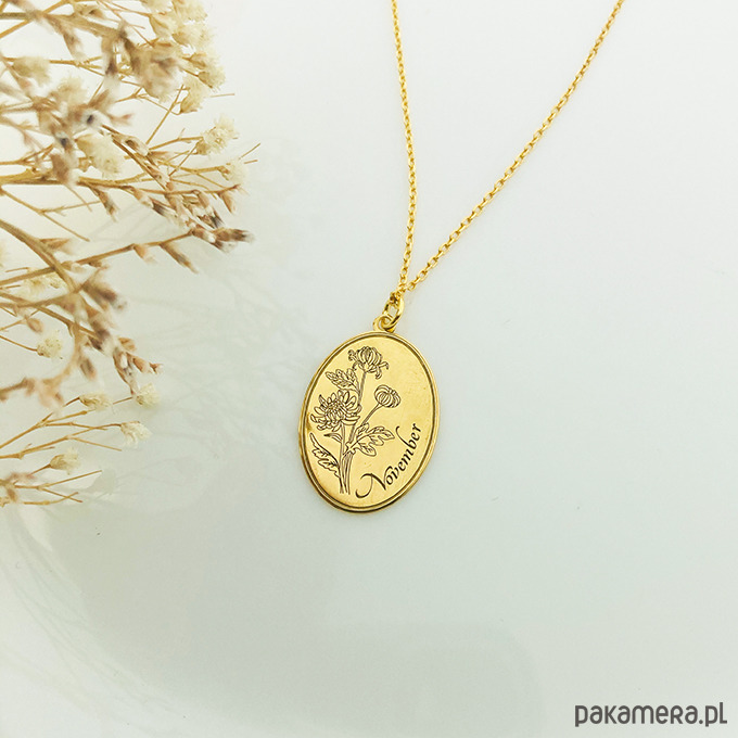 Delikatny naszyjnik z zawieszką z grawerowanym makiem, kwiat ten jest przypisany do miesiąca sierpnia . Kwiat oddany jest bardzo realistycznie. (W ofercie również inne naszyjniki z kwiatami miesiącami).