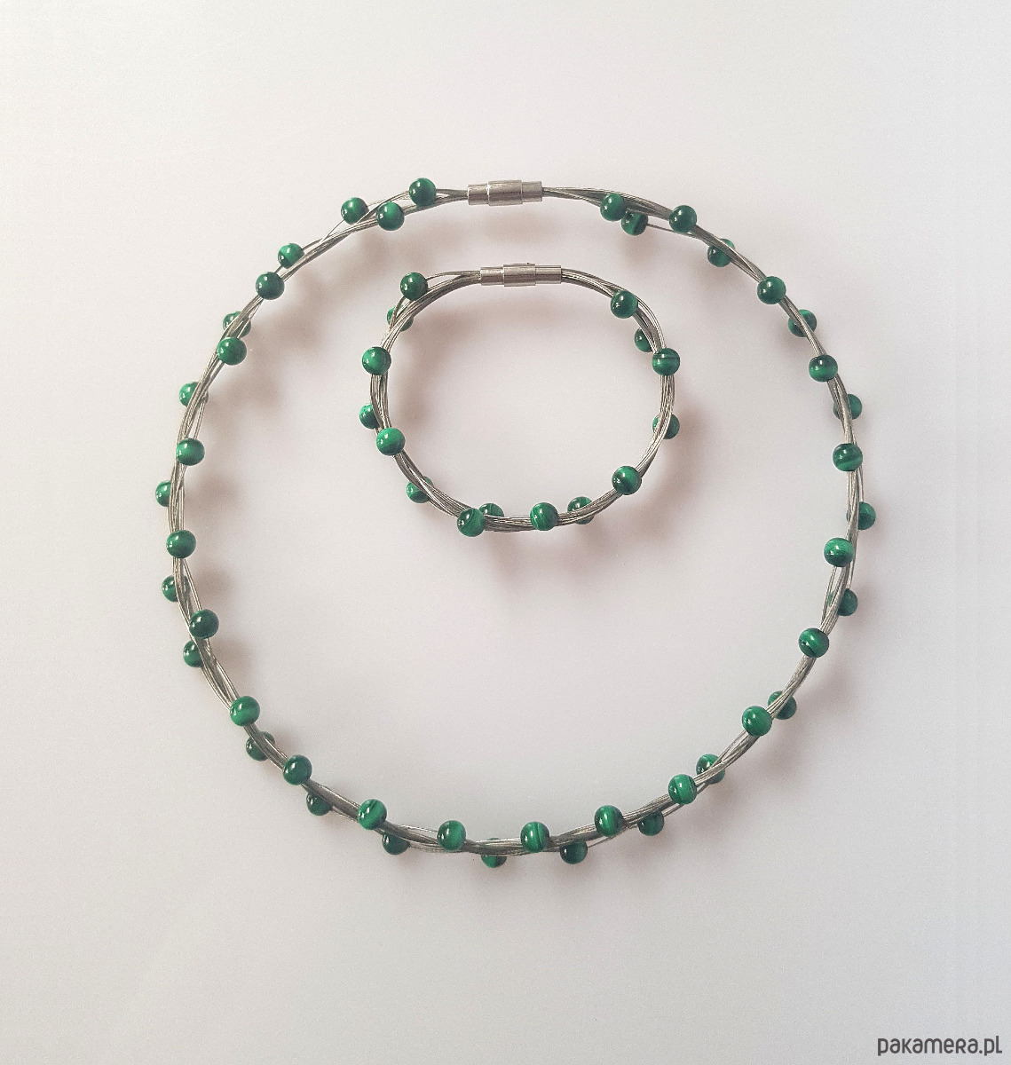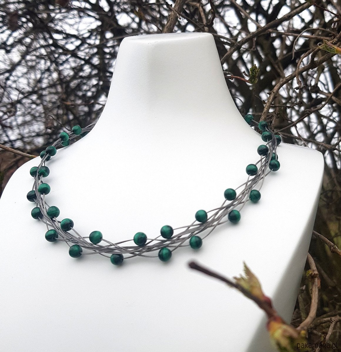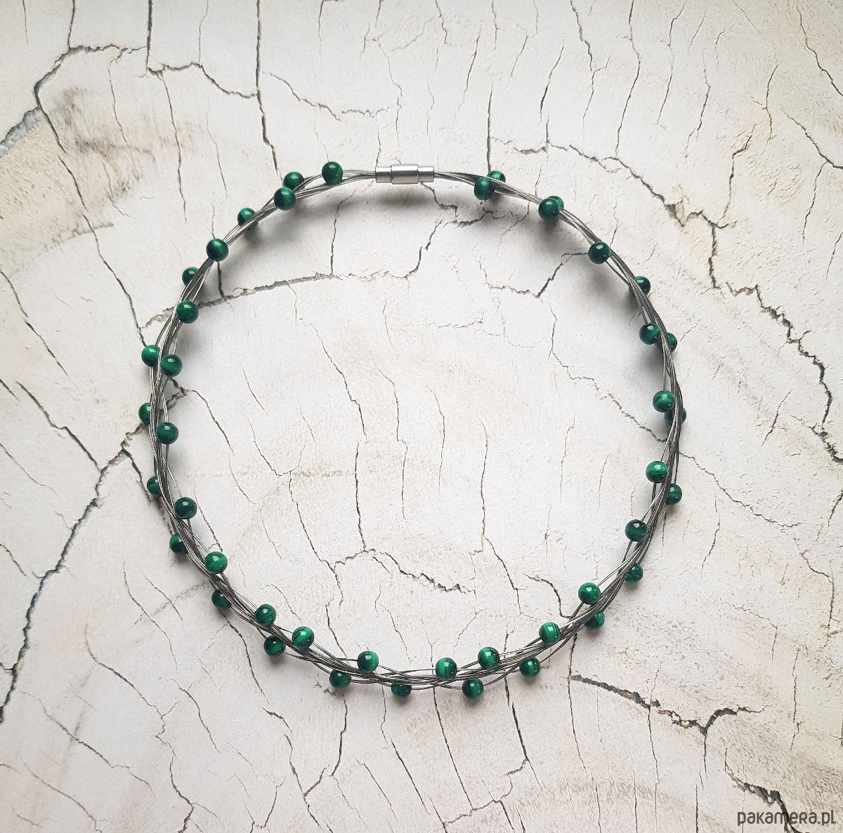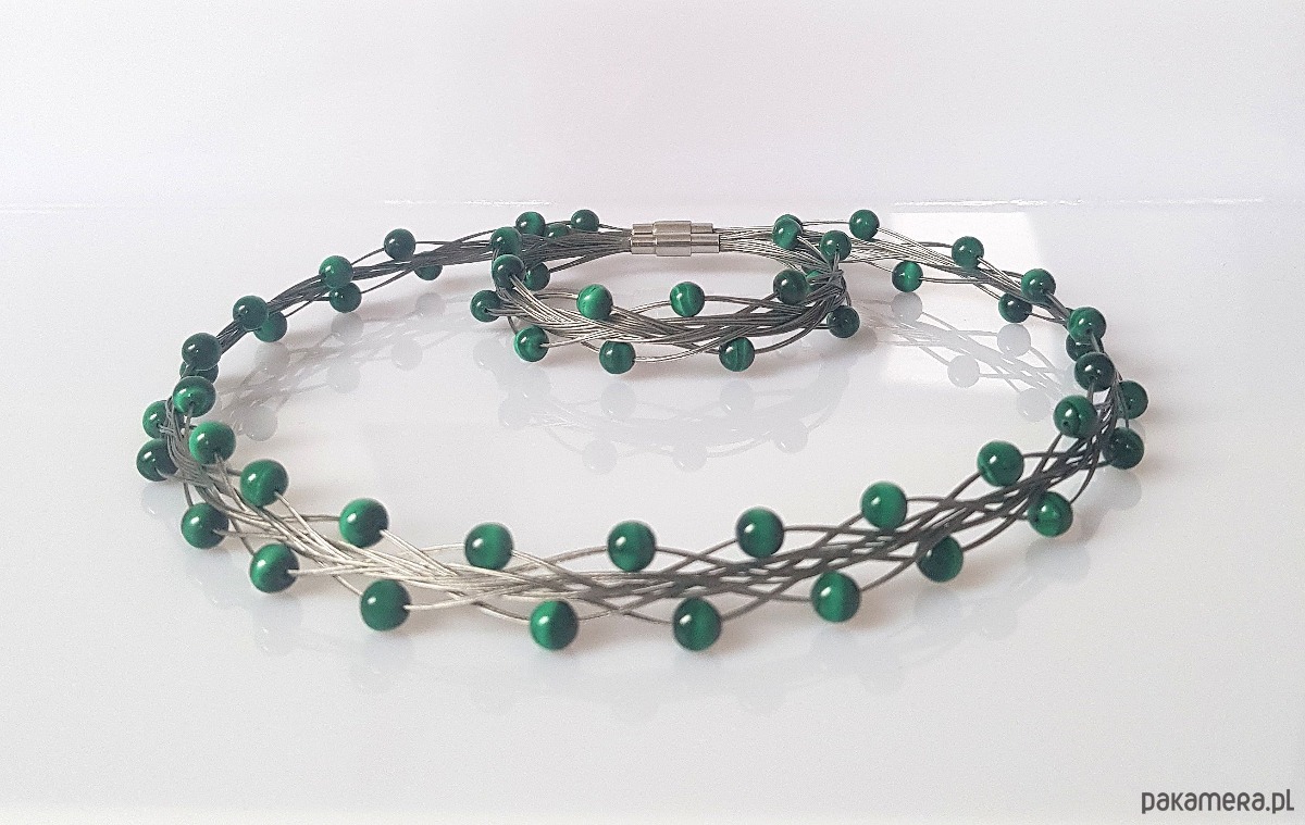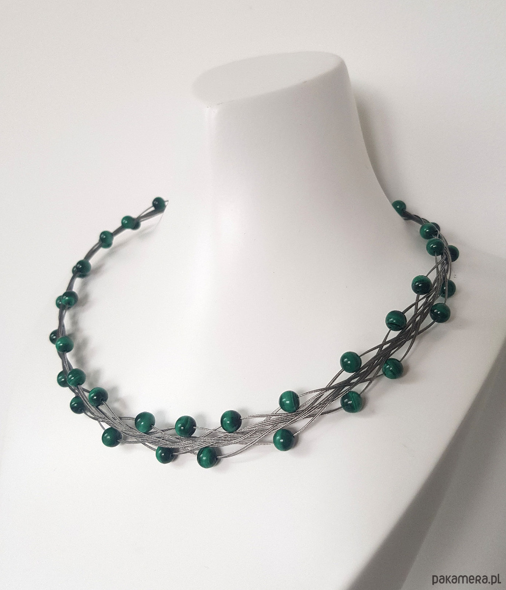 Elegancka kolia zapleciona na lince jubilerskiej z gładkich kulek malachitu.
