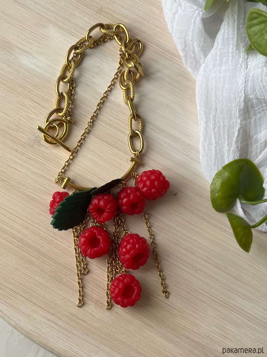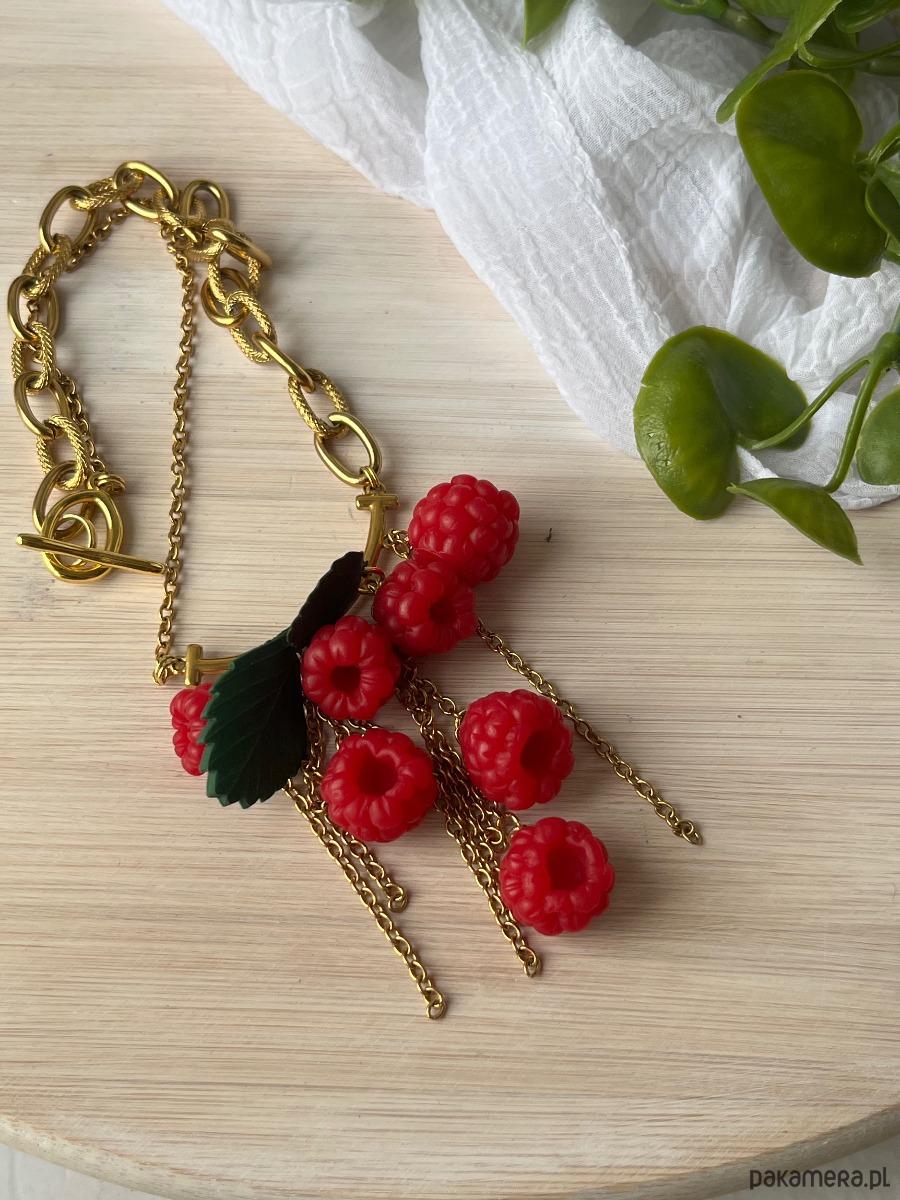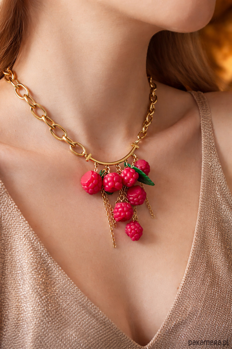 Dodaj swojej stylizacji soczystego koloru i radosnego charakteru. Ten efektowny naszyjnik zdobią niezwykle realistyczne czerwone maliny, wykonane z dbałością o każdy detal. Każdy owoc został ręcznie uformowany z glinki polimerowej, aby oddać wygląd świeżo zebranych jagód.