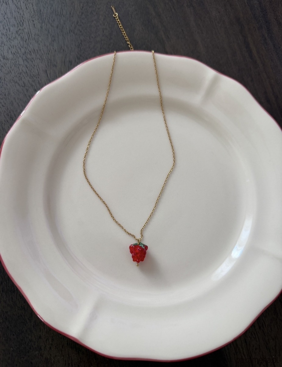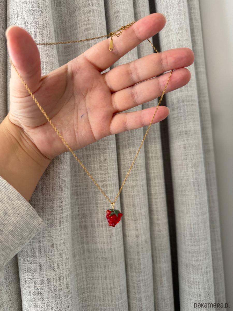 Ręcznie robiony naszyjnik z hipoalergicznej pozłacanej stali nierdzewnej ze szklaną malinką.