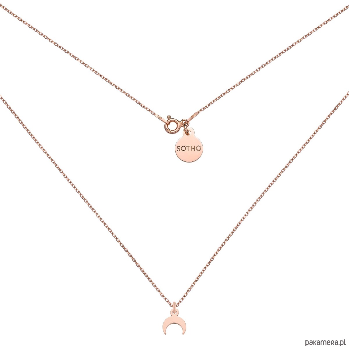 Złoty naszyjnik łańcuszkowy zdobiony małym księżycem i zawieszką z logo marki. Całość wykonana ze srebra 925 powlekanego 18 karatowym różowym złotem.