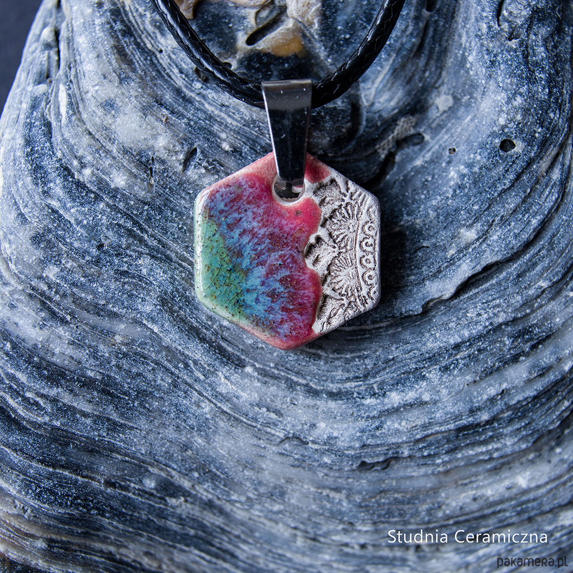 Naszyjnik ceramiczny z mandalą pokryty autorską mieszanką szkliw, które pięknie się przenikają