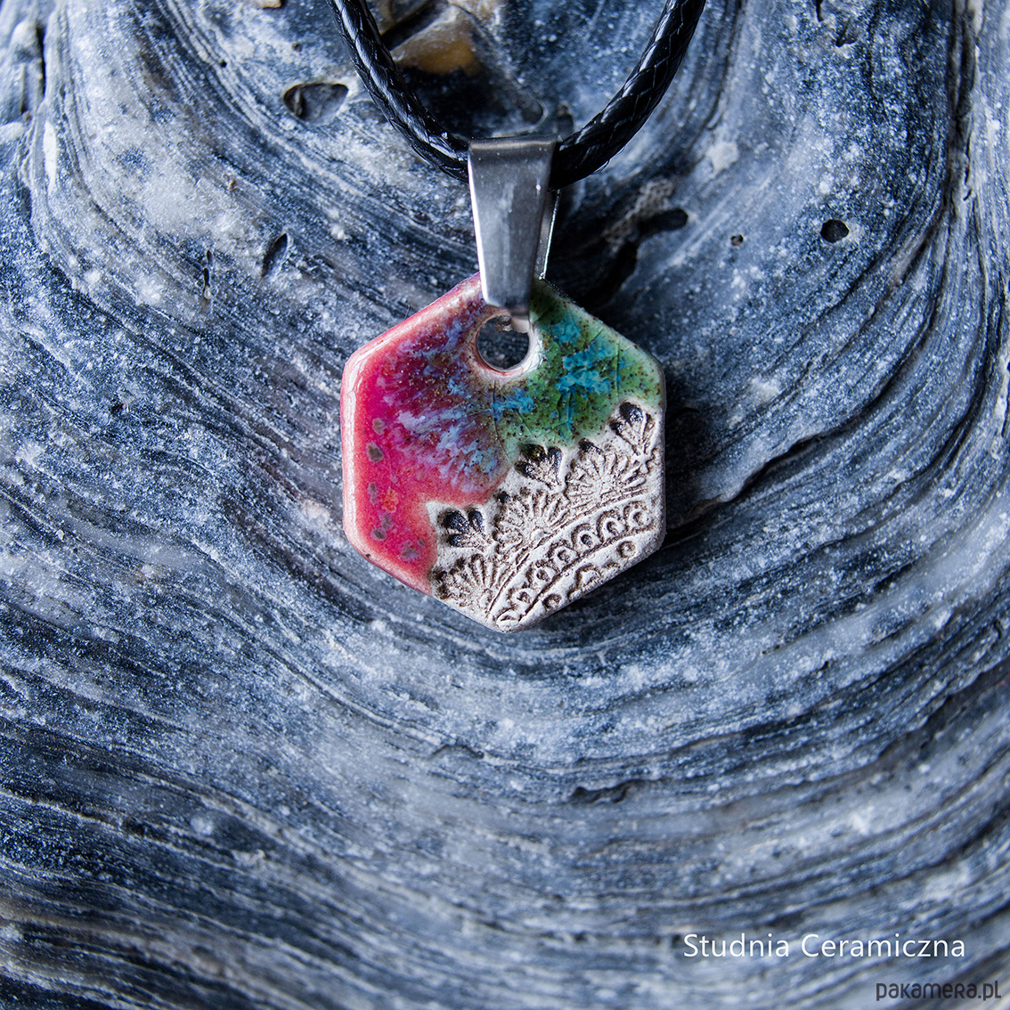 Naszyjnik ceramiczny z mandalą pokryty autorską mieszanką szkliw, które pięknie się przenikają