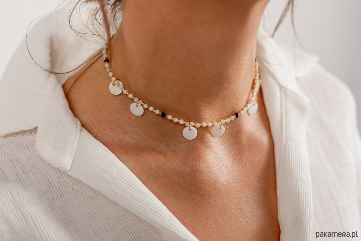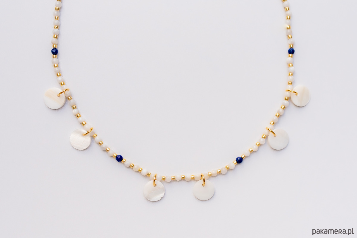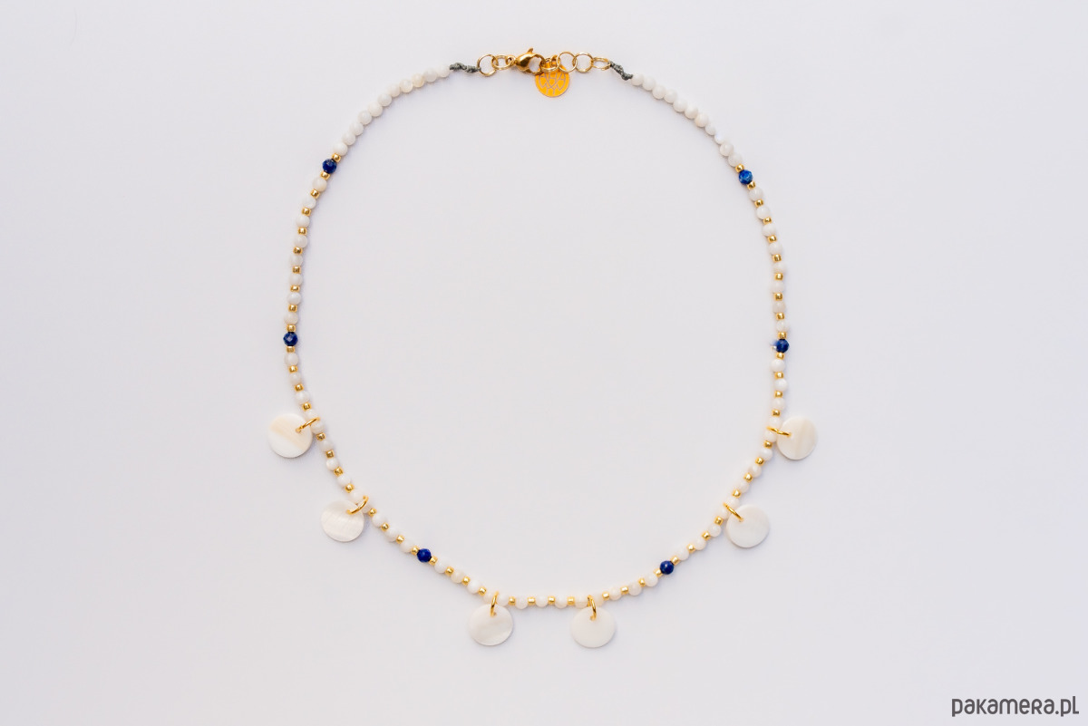 Ręcznie wykonany naszyjnik z krążków Masy Perłowej połączonych z kamieniami naturalnego Sodalitu oraz gładkimi Masami Perłowymi. Jasna kolorystyka sprawia, że naszyjnik idealnie sprawdzi się przy każdej stylizacji. Choker jest wyjątkowo wytrzymały oraz wodoodporny, a wszystkie użyte materiały są antyalergiczne. Wykończenie naszyjnika jest w kolorze złotym.
