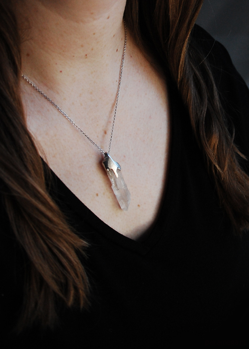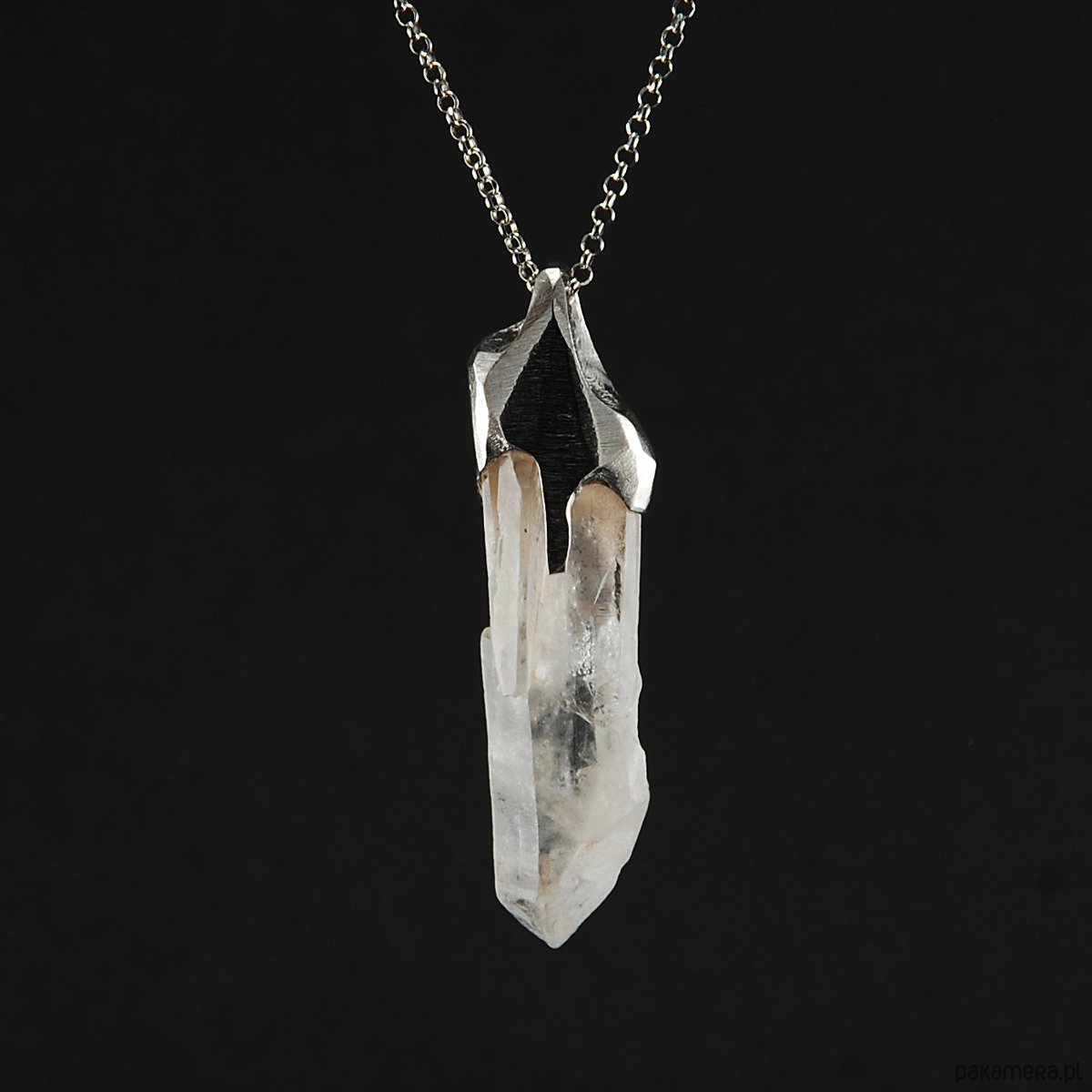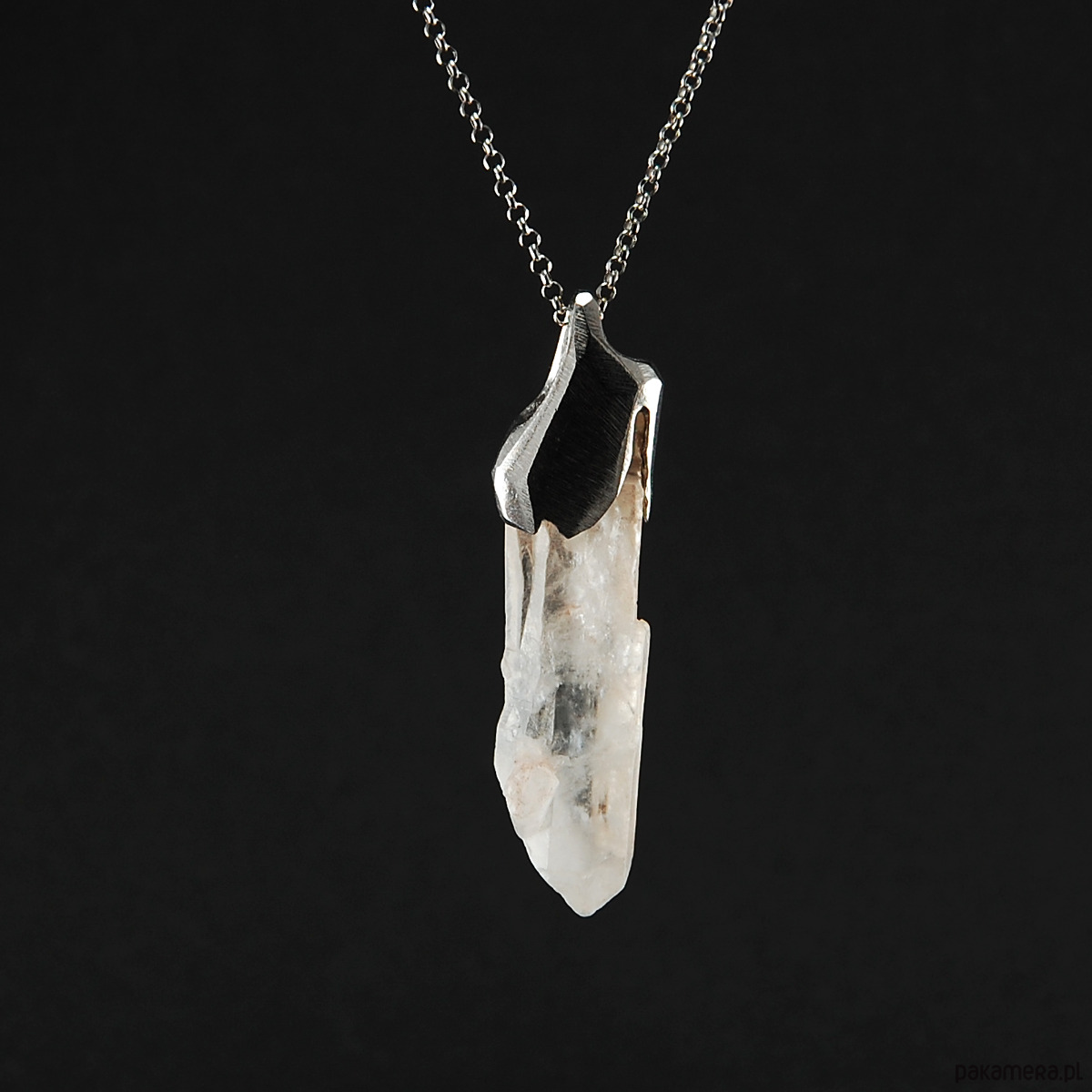 Naszyjnik wykonany z unikatowej bryłki kryształu górskiego oprawionego w srebro.