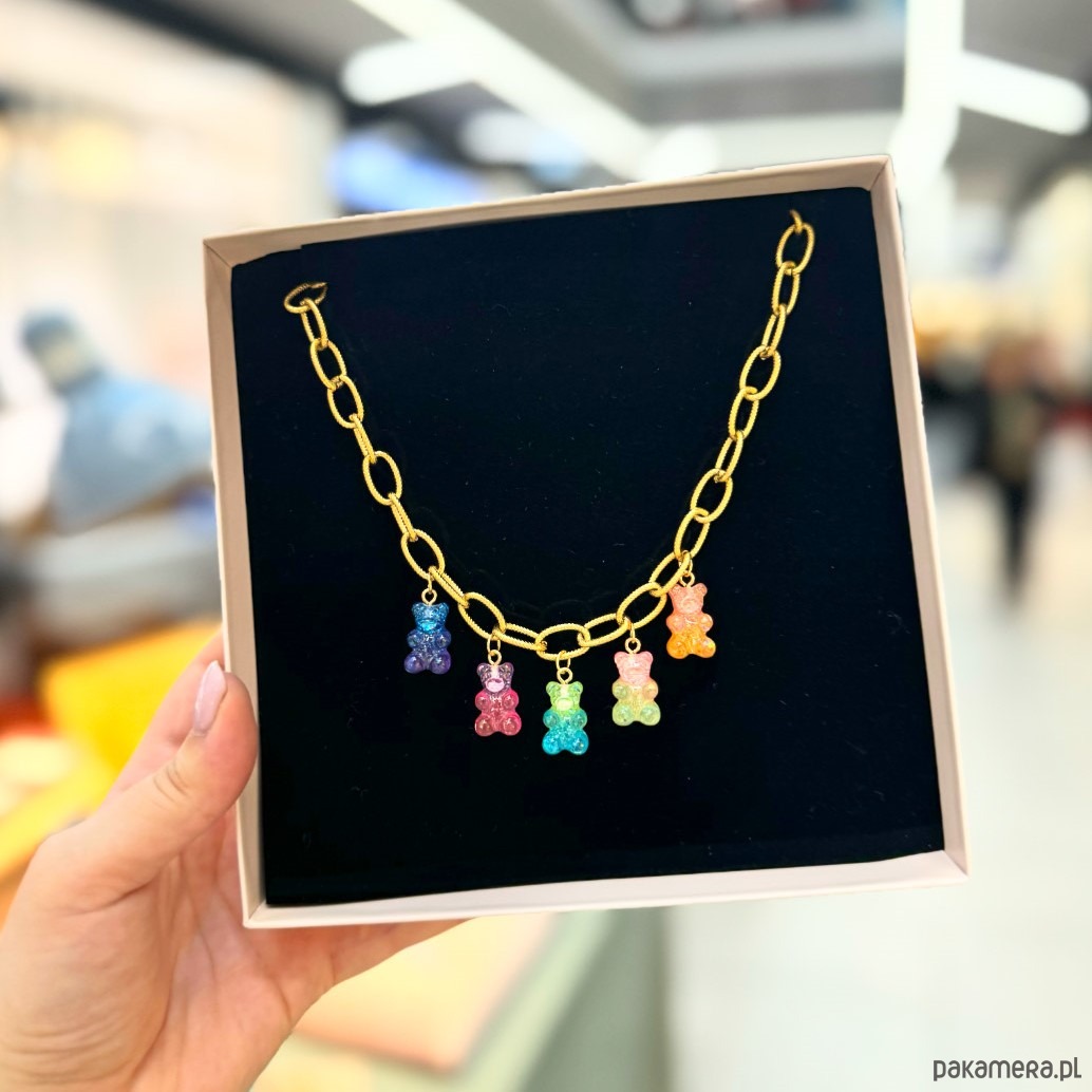 Żelki mają 2cm. Łańcuch jest wykonany ze stali chirurgicznej pozłacanej i ma długość 45cm.