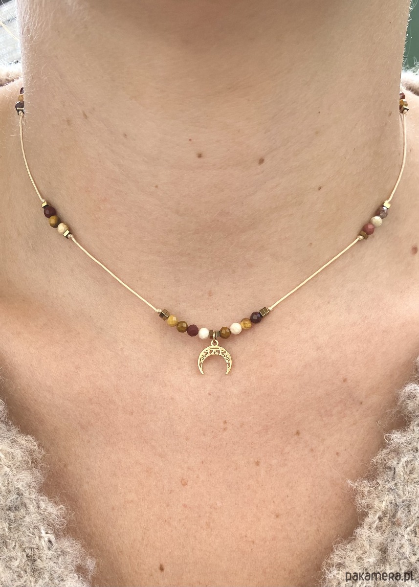 Kolorystyka naszyjnika została starannie skomponowana tak, aby przywoływać skojarzenia z jesienią – ciepłą, złotą, pełną naturalnych odcieni. Beżowy sznurek jubilerski subtelnie współgra z barwami kamienia, a złoty księżyc dodaje całości elegancji i blasku. Dzięki temu biżuteria świetnie sprawdzi się zarówno na co dzień, jak i na wyjątkowe okazje.