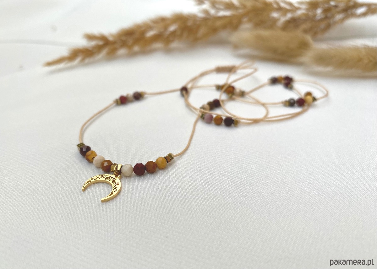 Kolorystyka naszyjnika została starannie skomponowana tak, aby przywoływać skojarzenia z jesienią – ciepłą, złotą, pełną naturalnych odcieni. Beżowy sznurek jubilerski subtelnie współgra z barwami kamienia, a złoty księżyc dodaje całości elegancji i blasku. Dzięki temu biżuteria świetnie sprawdzi się zarówno na co dzień, jak i na wyjątkowe okazje.
